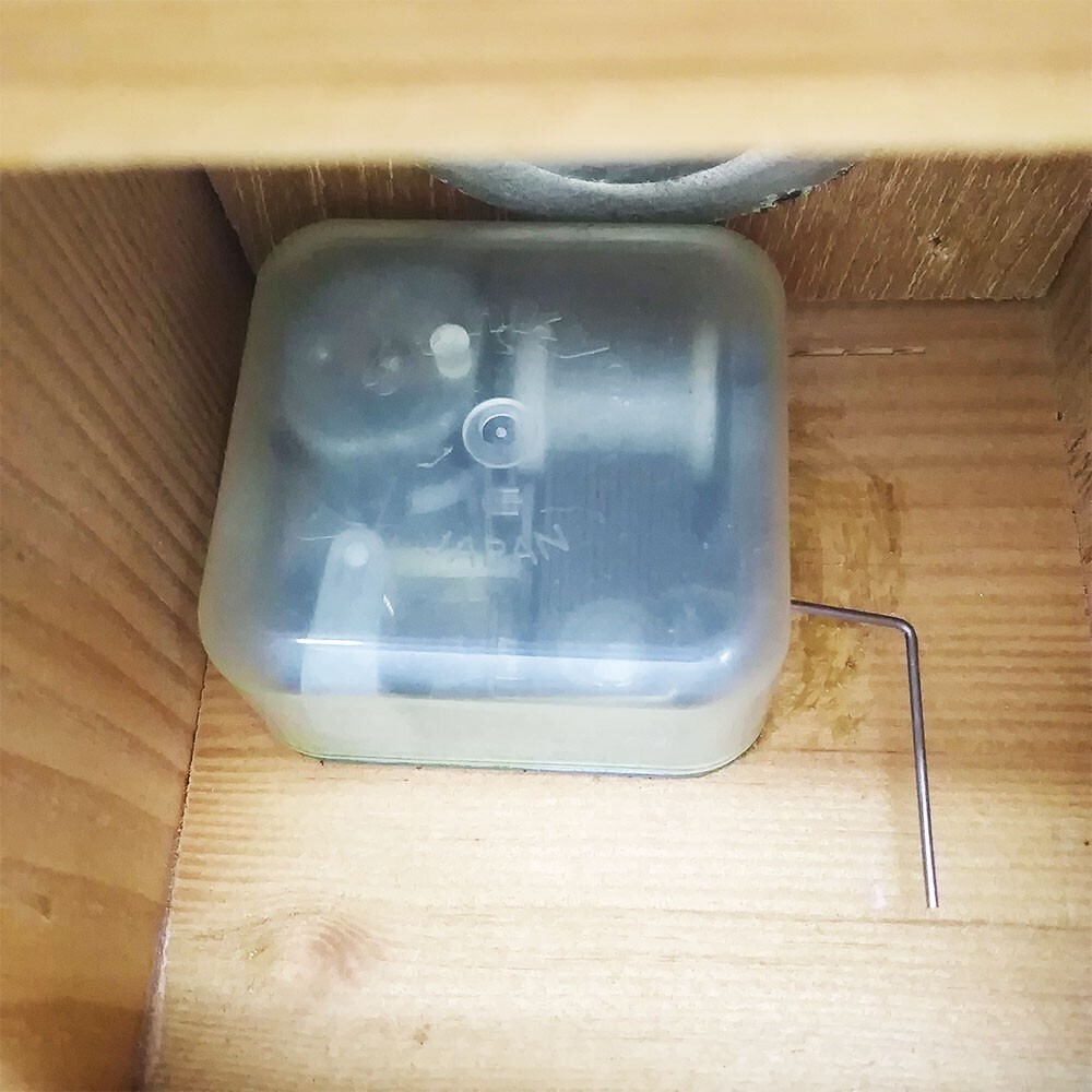 後ろ側にねじの回転、引き出しを引き出し音が鳴る動作の確認をしました。 また、ハンドルを回して刃が回転することを確認しました。