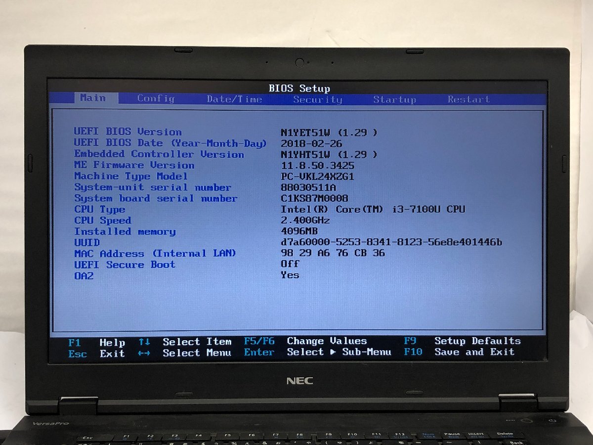 ジャンク/ NEC PC-VKL24XZG1 Intel Core i3-7100U メモリ4.1GB ストレージ無し 【K22171】