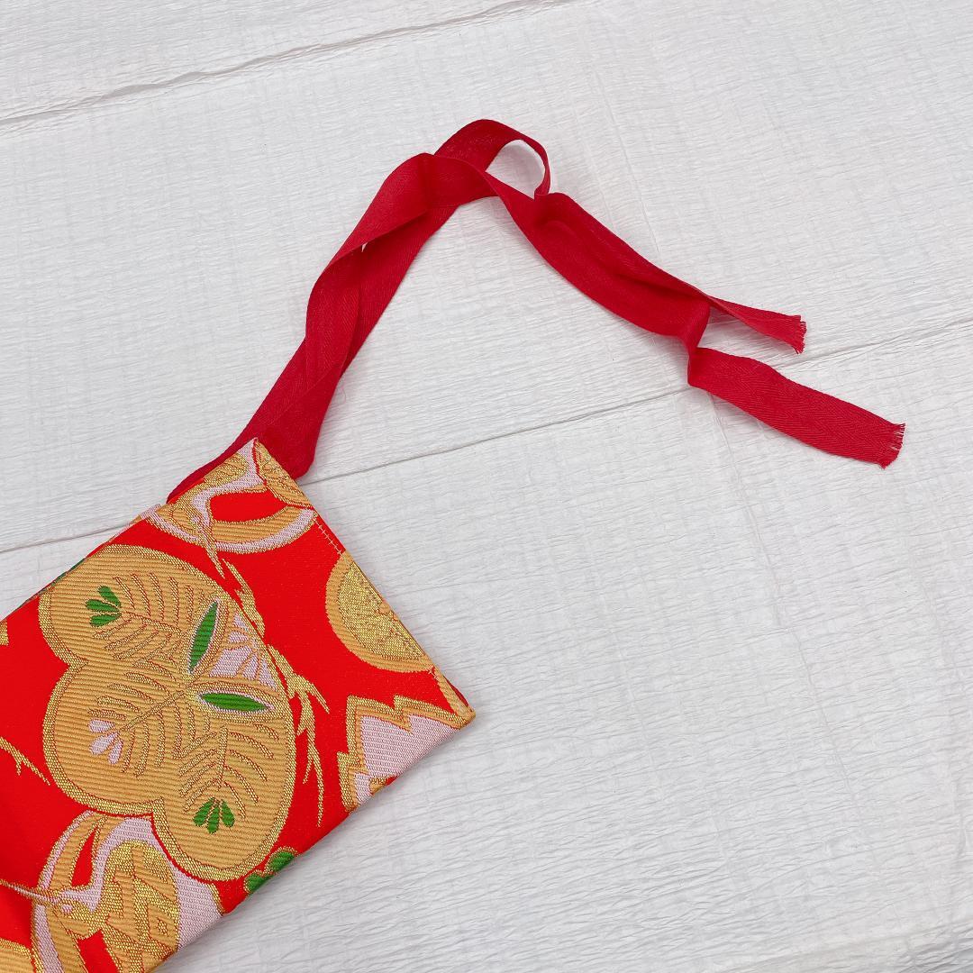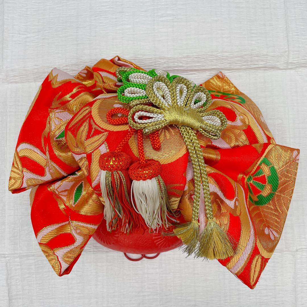 朱色、金色ラメ糸、緑色などで、キラキラします。