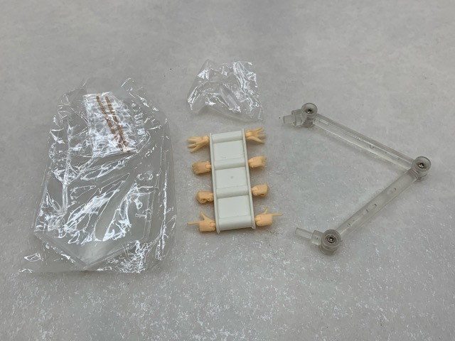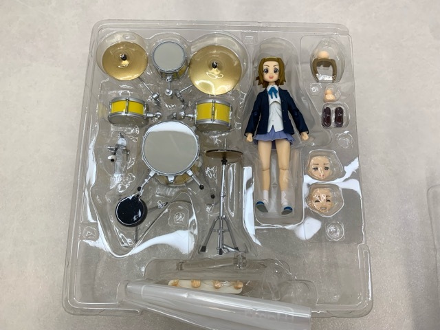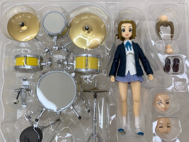 セット内容:フィギュア本体、交換用右手首×4、ドラムセット、たんこぶ×2、台座本体、台座アーム用ジョイント、交換用顔×2、交換用左手首×4、スティック×2、上履き一組、台座アーム、取扱説明書