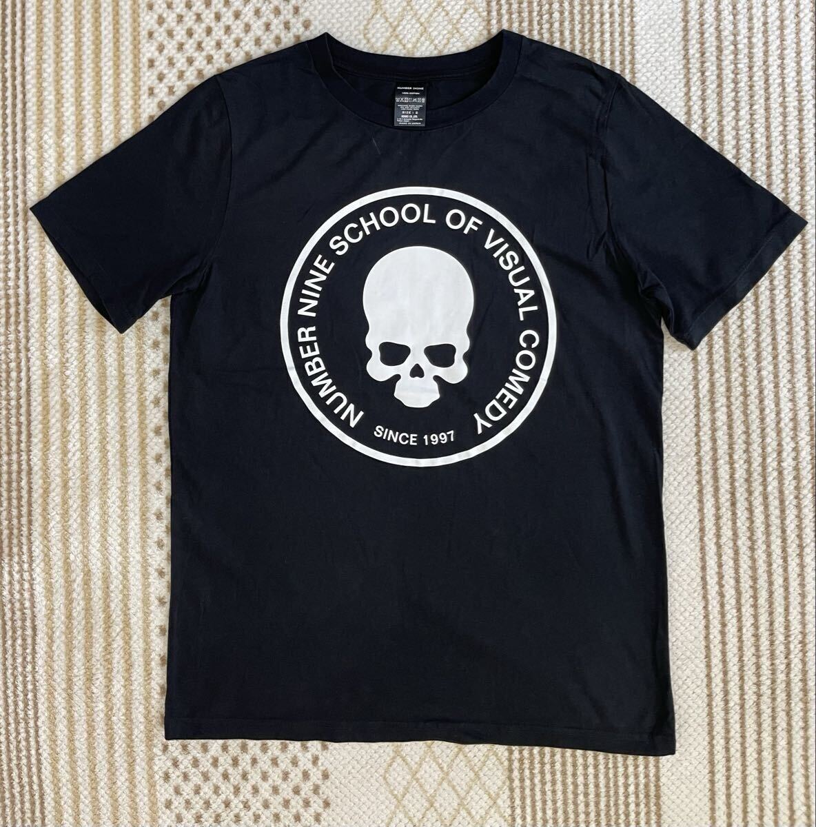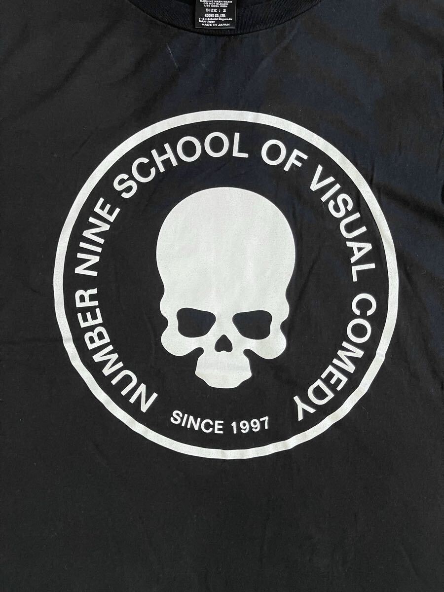 ナンバーナインのTシャツです。フロントには「NUMBER NINE SCHOOL OF VISUAL COMEDY SINCE 1997」のテキストと、ブランドを象徴するスカル(ドクロ)モチーフが大胆にプリントされています。