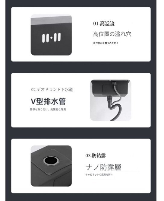 モダンなデザイン:シンクとキャビネットが一体化したスタイリッシュでエレガントなデザインは、どんなインテリアにもマッチします。シンクの表面は滑らかなポリッシュ仕上げで、お手入れも簡単。