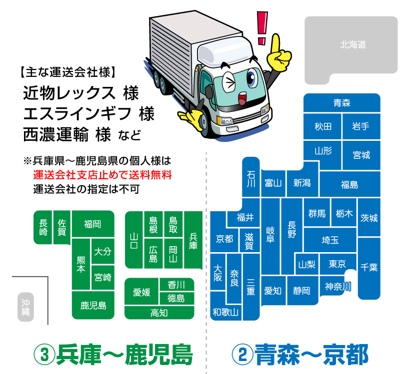 配送に ついて 【個人様宛】 | ●青森県~京都府の個人様宅宛て:ご指定のご住所まで送料無料 ・お届けは4トン車が通行可能なエリアに限ります。 ・2階以上の階上げは行っておりません。 ・指定日配達可能です。(ただし日祝日は除きます) ・配達時間帯の指定は不可、午前/午後の希望を送り状に明記のみであれば可能です。 (確実なお約束はできかねます。) ●兵庫県~鹿児島県の個人様宅宛て:運送会社支店にてお引き取りで送料無料 ・主な運送便:近物レックス、エスラインギフ、西濃運輸など ※運送便の指定はできません。ご注文前にご案内することも可能です。 |