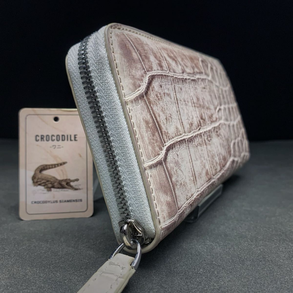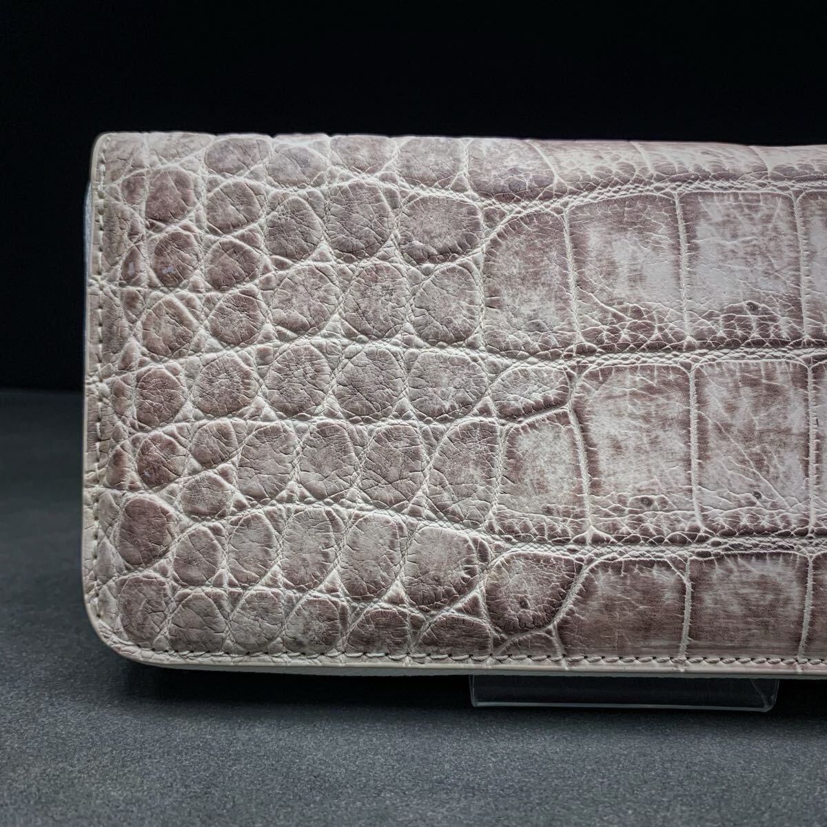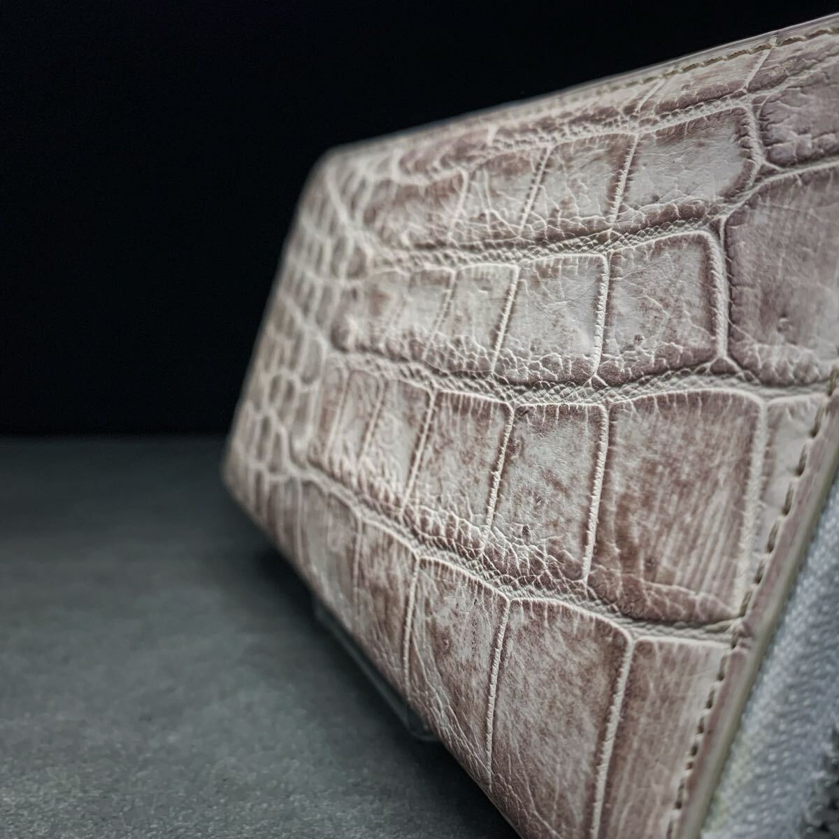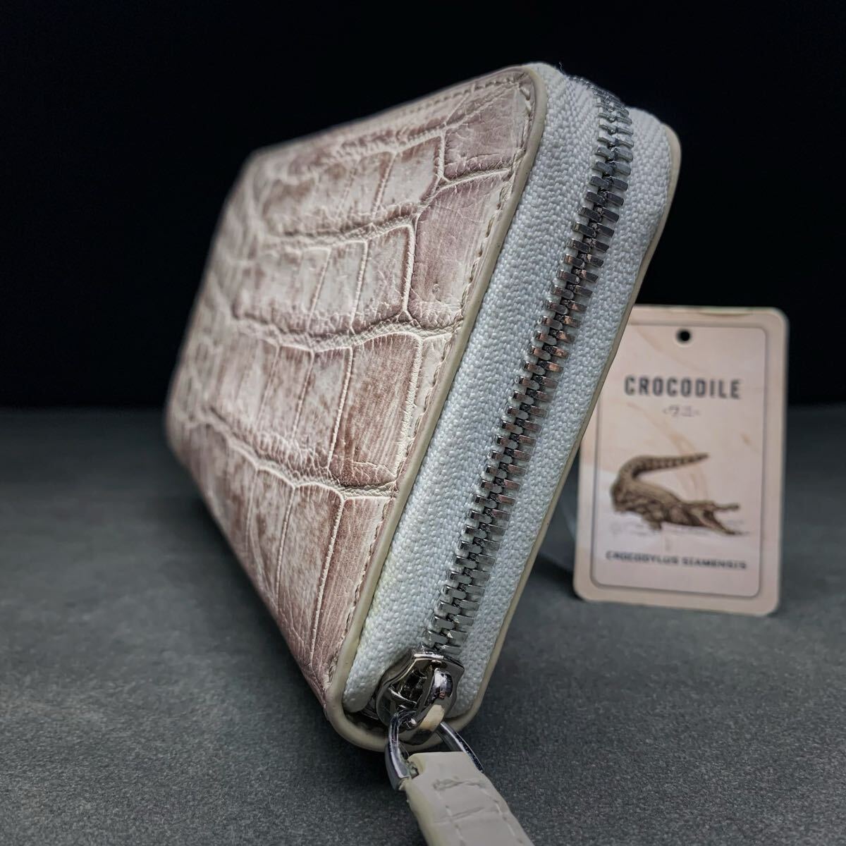 クロコダイルと呼ばれている品種のワニ革は人気が高く、独特の模様と凹凸が魅力で、高級ブランド品を中心にクロコダイルが多く使われています。今回はワニ革の代表格である<シャムクロコダイル>の背革部のラウンドファスナー財布を出品します。