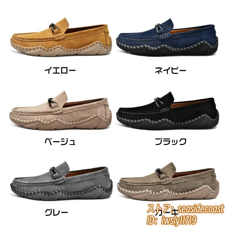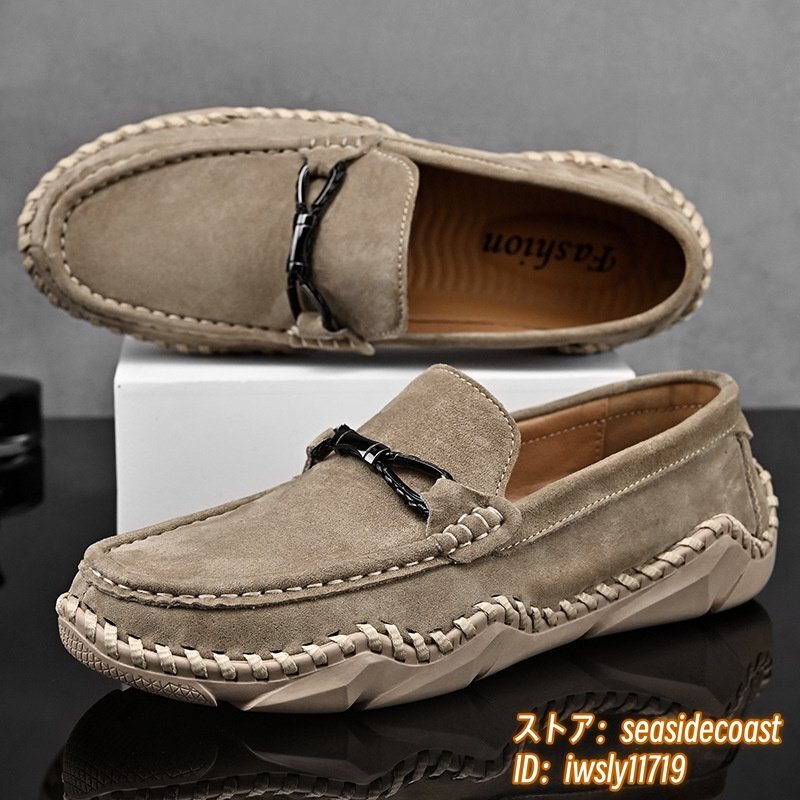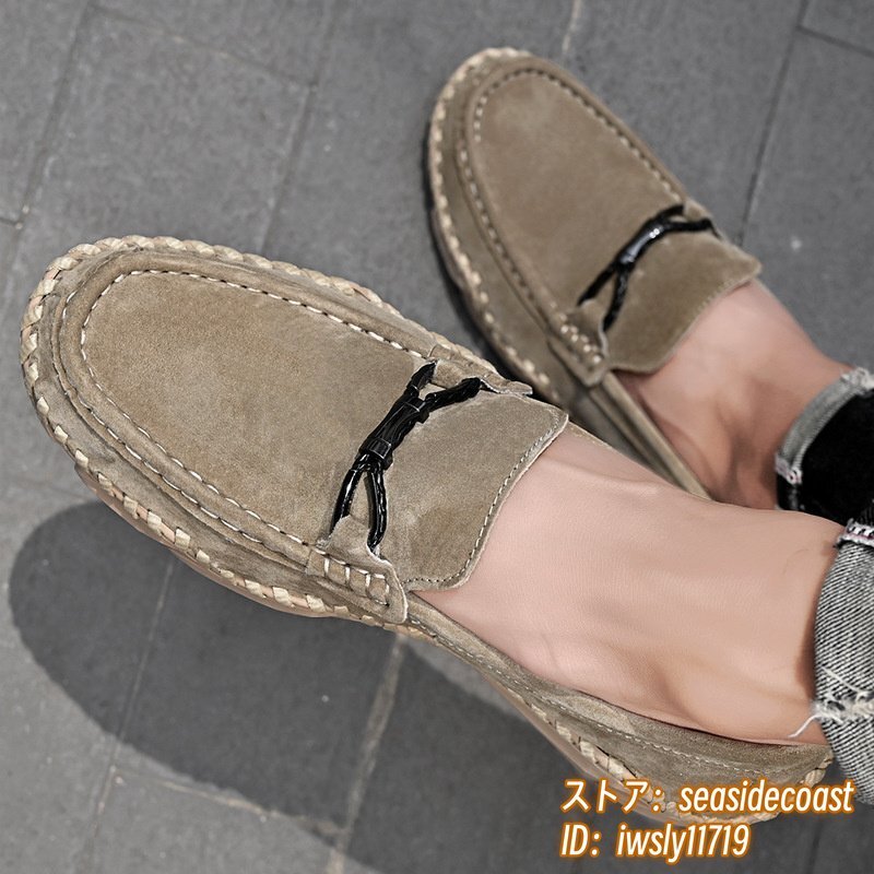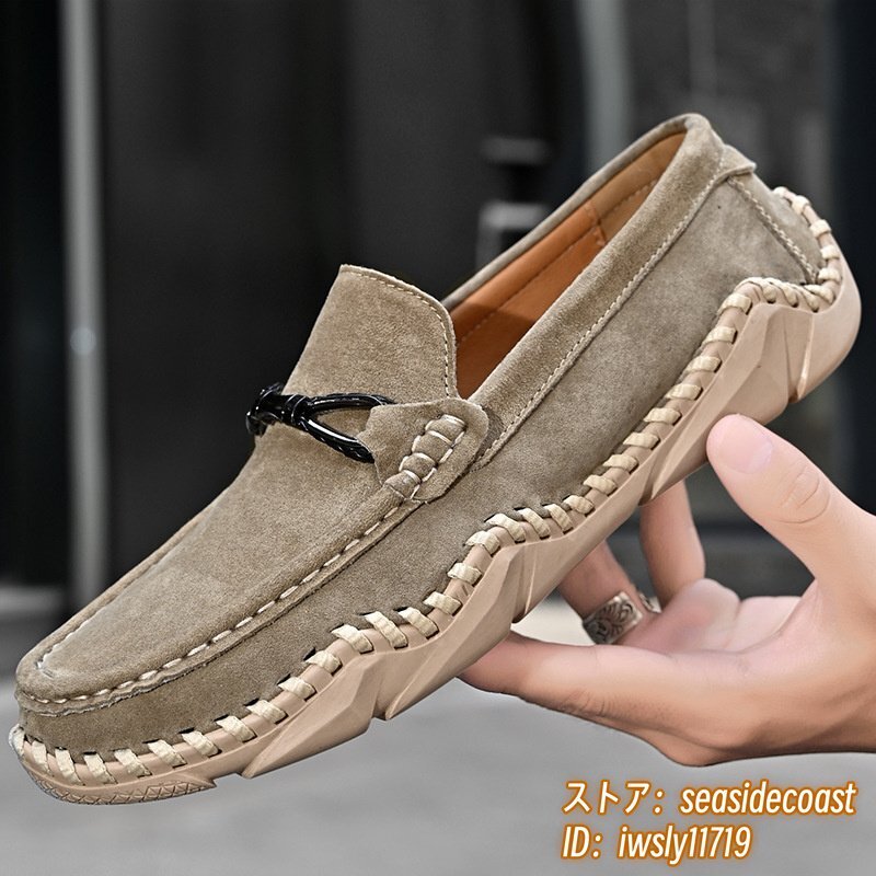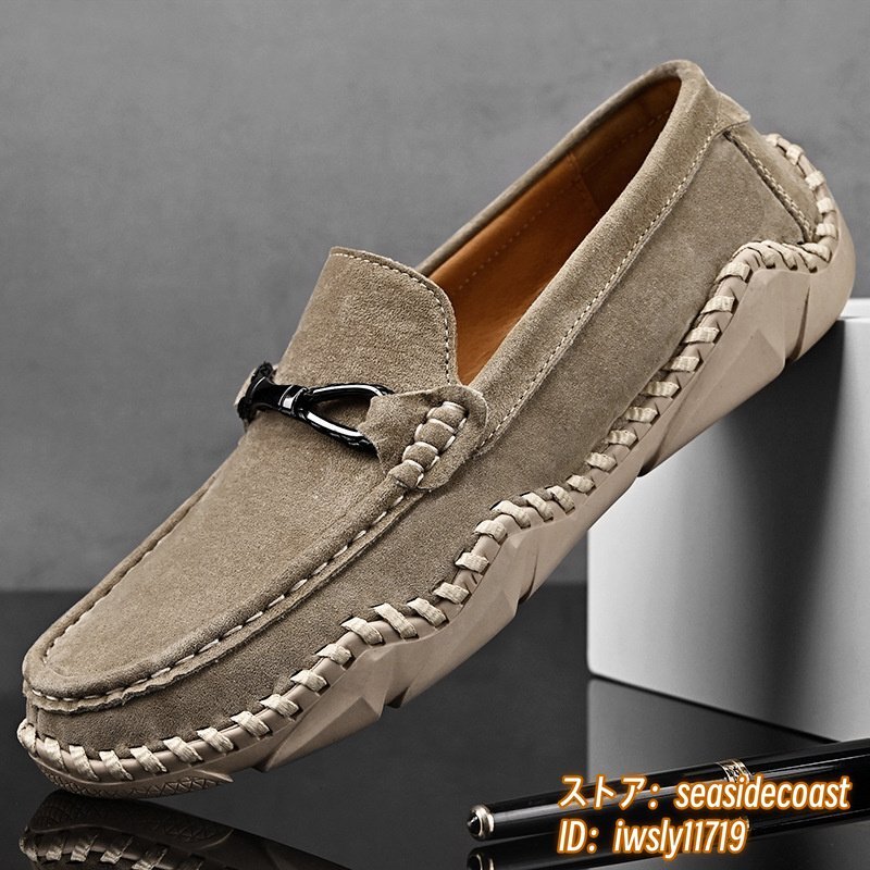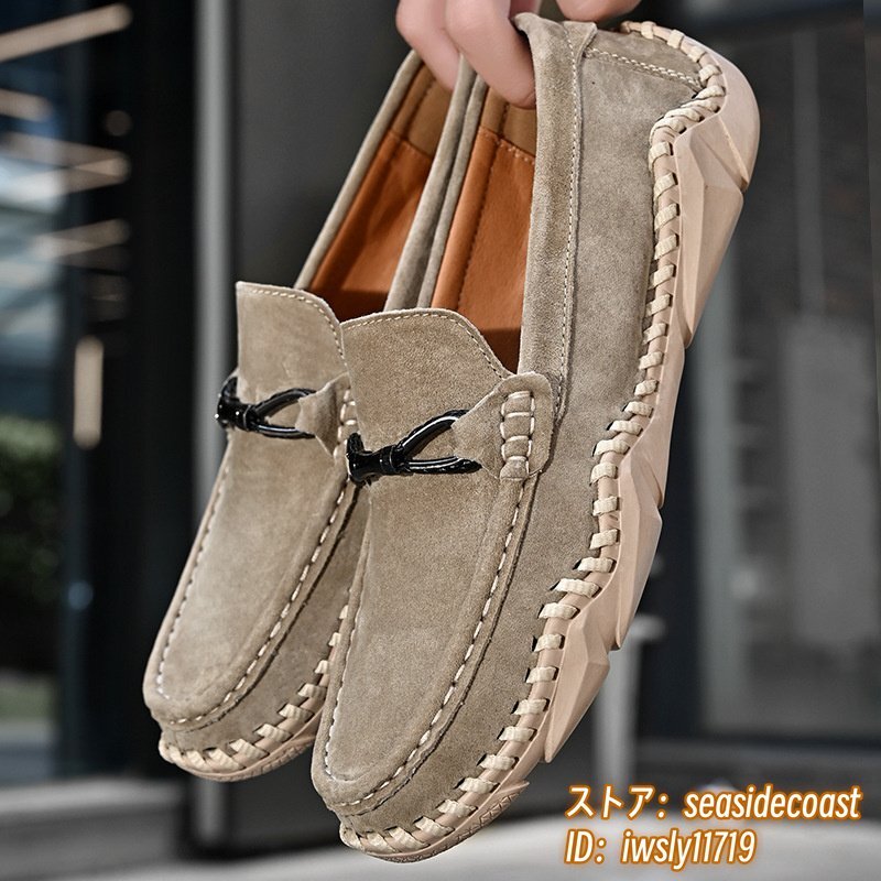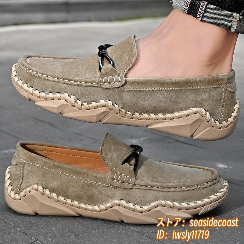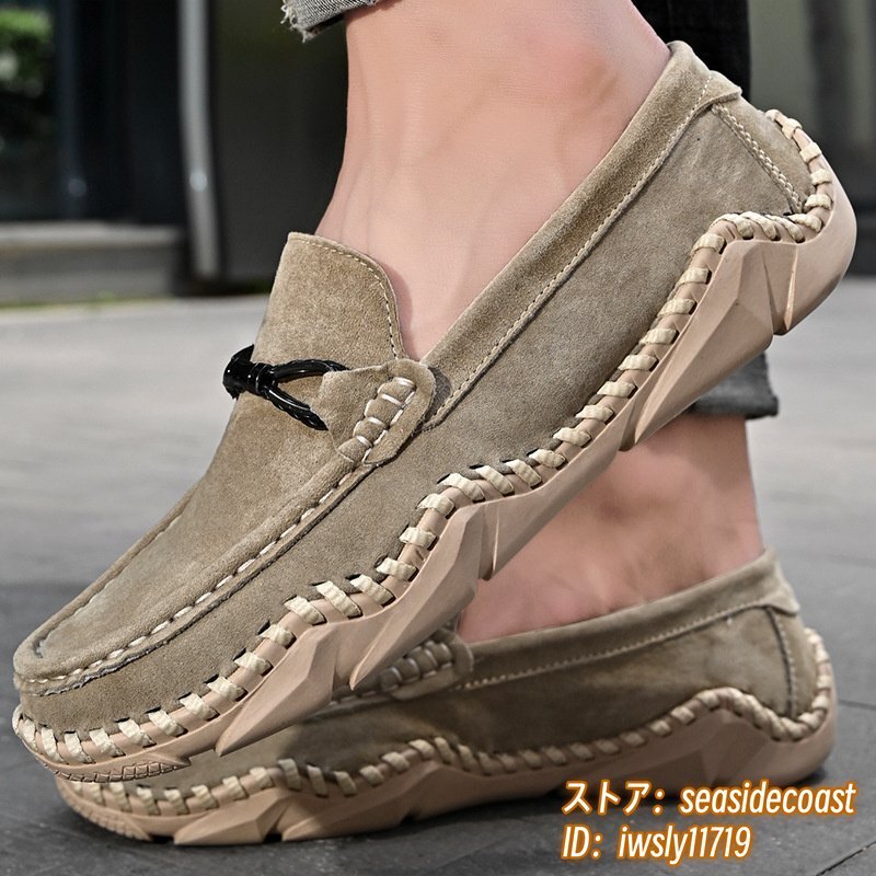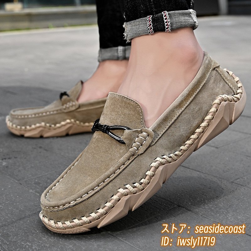 新品■ドライビングシューズ メンズ 本革 ローファー スリッポン スエード革 牛革 レザーシューズ アウトドア 通気性 快適 カーキ 24.5cm