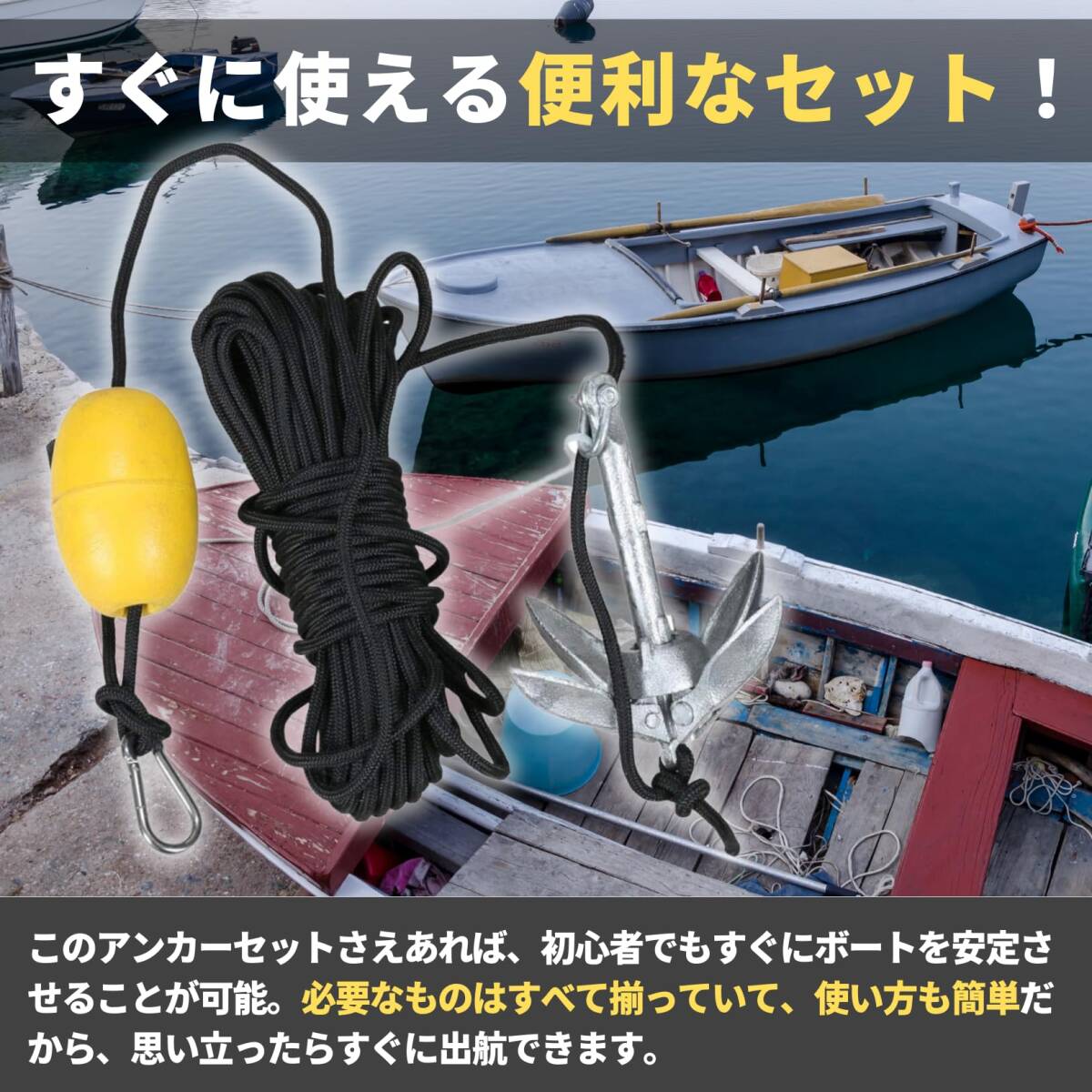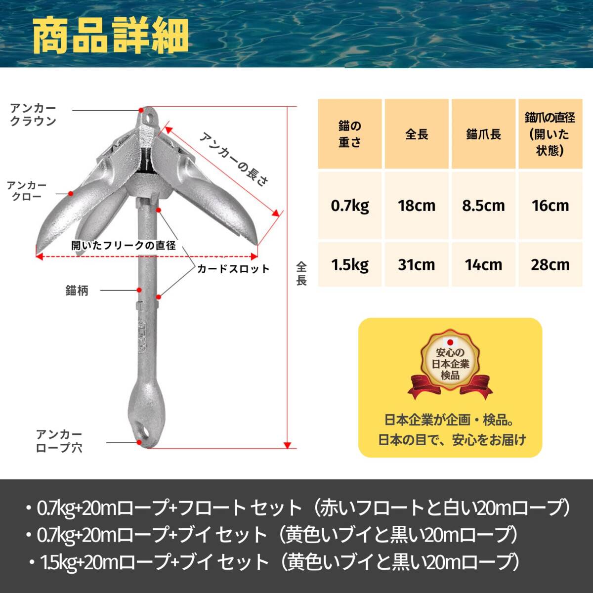 【セット内容】アンカーサイズ:重量約0.7kg〜からお選びいただけます / ロープ:約20m / フロート:約9.5cm×約6.5cm (フロートセットに付属)/ ブイ:約12.5cm×約7cm(ブイセットに付属) / 材質:アンカー:炭素鋼 メッキ製(溶融亜鉛メッキ) / ロープ:ナイロン