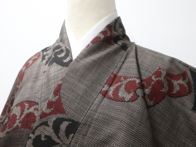 リサイクル商品のため、上前衽、後ろ身頃、八掛に薄シミ汚れがございますが着用可能なお品です。 地色はこげ茶です。 1枚目の画像が近いお色かと思われます。 素材は正絹です。  |