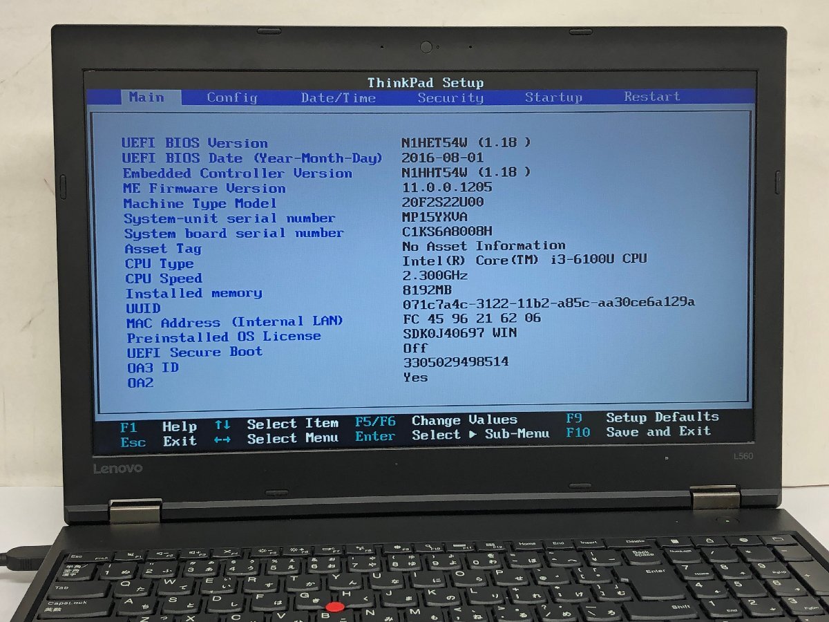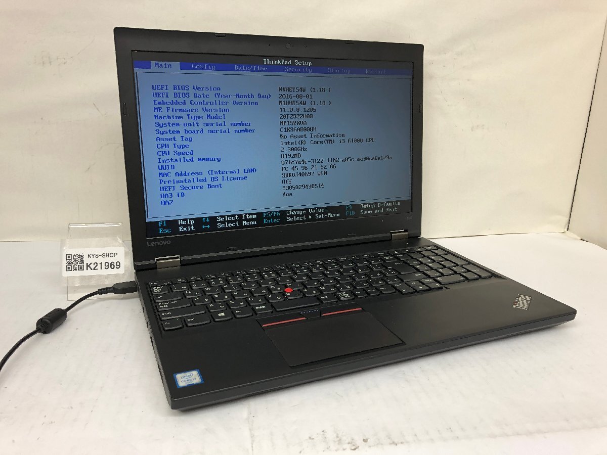 ジャンク/ LENOVO 20F2S22U00 ThinkPad L560 Intel Core i3-6100U メモリ8.19GB ストレージ無し 【K21969】