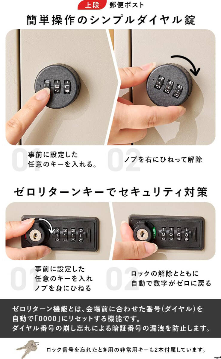 ダイヤル錠式の扉で簡単にロックでき、面倒な設定や電源も不要。