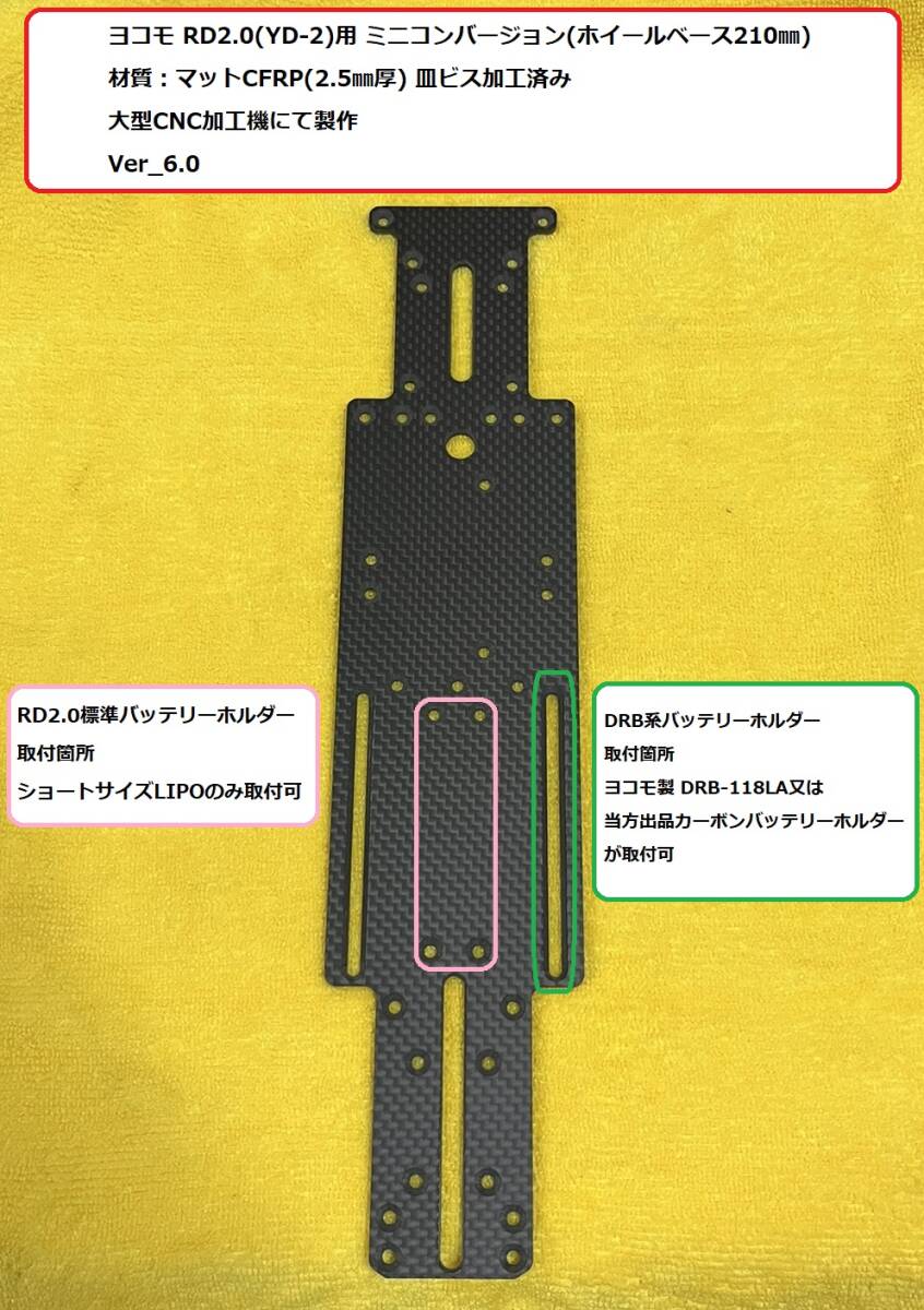| 商品説明 | 【商品の説明】 ブランド、メーカー:オリジナル(大型CNC加工機製皿ビス加工済み) 型番:Ver_6.0 カラー:マットカーボン(板厚2.5㎜) 【商品の状態】 商品内容:シャーシ本体 特徴:ホイールベースは210㎜ボディ用になります RD2.0 RD1.0 YD-2系列のパーツが一通り取付可能です 6.0バージョンより48㎜前後のサスマウントの逆付けが可能になりました 5.0バージョンより、RD2.0基準の穴位置になりましたのでギヤボックスは RD2.0のものを使用することが前提のシャーシとなっております アッパーデッキは従来から出品している210㎜タイプのものが継続使用できます RD2.0付属サスマウントを使用される場合は、当方出品の32㎜サスアームの同時使用をオススメします(3Dプリンター製) RD2.0付属サスマウント以外を使用される場合は取付例画像のヨコモCタイプ 前後のサスマウントを使用し、サスピンはタミヤ製をご使用ください(OP.1613) DRB用バッテリーホルダーが4点止めで取付ができます (YD-2純正バッテリーホルダーはご使用いただけません) 又当方出品バッテリーホルダーもご使用いただけます 当方出品バッテリーホルダーステーを使用しバッテリー位置を前後に 調整することもできます (DRB用バッテリーホルダーDRB-118LA又は当方出品カーボンバッテリーホルダー を使用してください) 注意事項:NCNR 画像2~4は取付例です出品物には含まれませんのでご注意ください。 多少の小傷等ある場合がありますがご了承ください。 同梱発送可能です、支払い前にまとめて発送をご選択をお願いします。 不明点はご質問ください。 複数枚ご希望の方は割引ますので事前に質問欄にてご連絡お願い致します。 (2枚目以降1,000円割引いたします) |