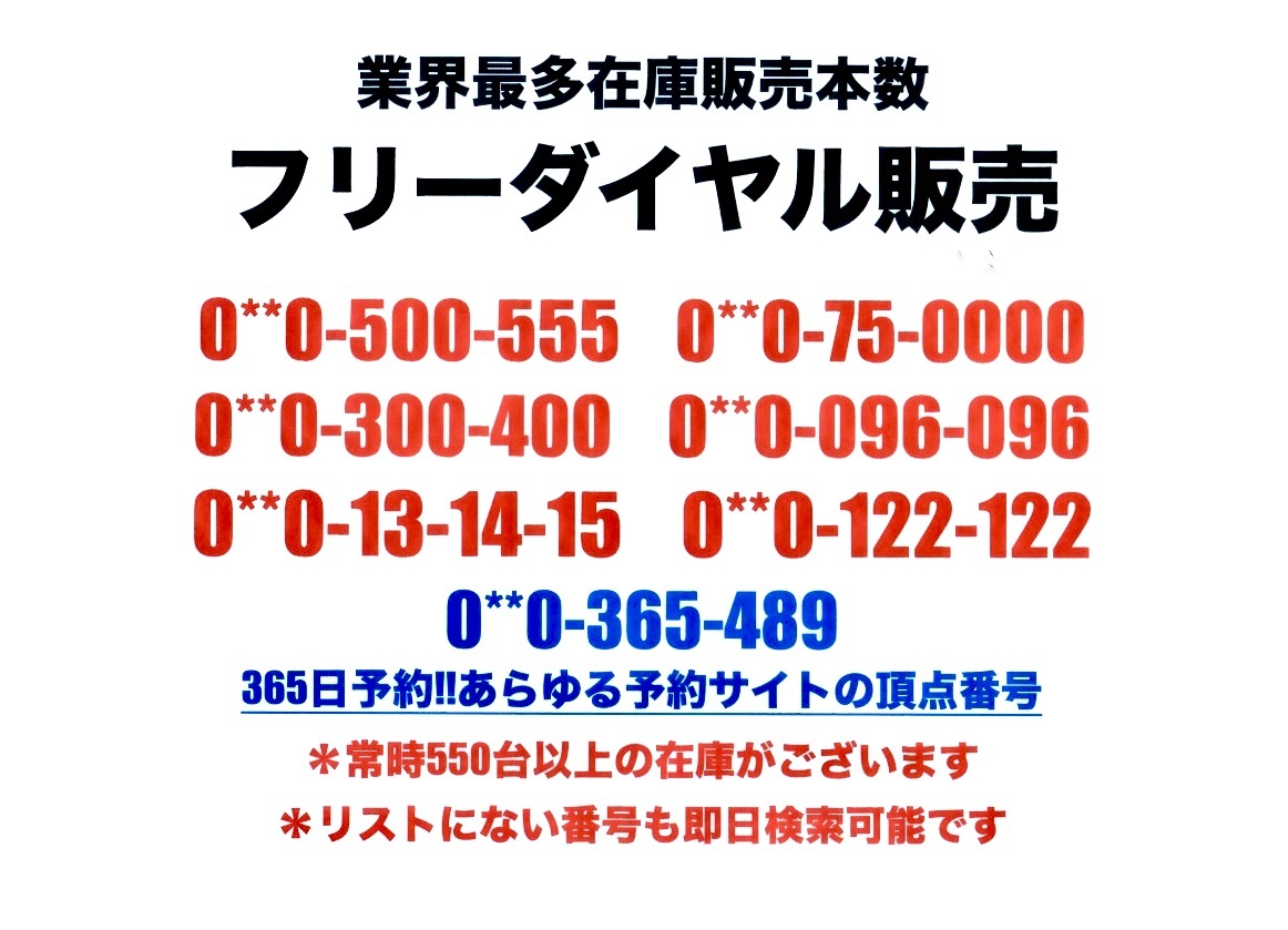 商品説明 | 【御社の“顔”を創る番号戦略】 顧客の記憶に残る、差別化されたフリーダイヤル CMや企業ブランディングに最適な「超希少番号」多数! ご希望の番号、即日検索可能、翌日取付完了、全国対応! 10月新入庫番号 0**0-00-3535/125,000円/最高最高・ 0**0-35-4129/85,000円/最高良い肉・ 0**0-56-4129/95,000円/コール良い肉・ 0**0-461-461/280,000円/白い白い・ 0**0-52-5000/115,000円・ 06-64*1-1111/155,000円/大阪市西淀川区・ 06-647*-1111/110,000円/大阪市西淀川区・ 0797-*-22222/250,000円/兵庫県芦屋市・ 0797-*2-2888/40,000円/兵庫県芦屋市・ 0797-*2-6888/40,000円/兵庫県芦屋市・ 072-72*-7777/110,000円/大阪府箕面市・ 072-72A-2222/70,000円/大阪府箕面市・ 072-72A-7777/110,000円/大阪府箕面市・ 072-7AA-5555/100.000円/大阪府箕面市・ 072-7AA-6666/90,000円/大阪府箕面市・ 072-7AA-9999/80,000円/大阪府箕面市・ 10月プライスダウン番号 0**0-21-7000/135,000円→75,000円・ 0**0-68-8000/135,000円→68,000円・ 0**0-25-3333/195,000円→90,000円・ 奈良市古市 0742-*1-1111 ¥250,000- 超希少1の5桁ゾロ目!! 京都市内河原町 075-*-111111 ¥14,300,000- 京都NO1番号(企業やホテルに最適!) 075-*11-8888 ¥650,000- 上記番号とセット販売可能↑ 075-AA1-1111 ¥3,850,000- A同番号 (11111番企業番号!!!) 075-AAA-0001 ¥3,580,000- A同番号 075-AAA-8888 ¥3,850,000- A同番号 075-AAA-7777 ¥3,850,000- A同番号 075-2*2-0001 ¥880,000- 希少0001番 075-2*1-7777 ¥150,000- 075-22A-1000 ¥95,000- 075-22A-1234 ¥155,000- 075-2*2-4444 ¥85,000- 075-22*-0888 ¥50,000- 075-22*-0333 ¥50,000- 京都大原全域 075-7AA-AAAA ¥8,580,000- A同番号 超希少7桁! 京都東山祇園周辺 075-5*5-9999 ¥180,000- 大阪府箕面市 072-72*-7777 ¥110,000- 072-72A-2222 ¥70,000- 下1本A同番号 072-72A-7777 ¥110,000- 072-7AA-5555 ¥100,000- 下3本A同番号 072-7AA-6666 ¥90,000- 072-7AA-9999 ¥80,000- 兵庫県西宮市苦楽園 0798-7*-7777 ¥110,000- 0798-7*-6666 ¥80,000- 大阪府和泉市 0725-5*-1000 ¥75,000- 0725-5*-1001 ¥35,000- 大阪市阿倍野区 06-662*-1000 ¥50,000- 06-662*-8888 ¥110,000- 06-662*-9999 ¥70,000- 沖縄宮古島市 0980-7*-4444 ¥50,000- 0980-7*-9000 ¥30,000- 高知市内中心部 088-87*-0001 ¥80,000- 希少1番!! 088-87*-0008 ¥40,000- Good Free dial 0**0-400-400/6,580,000円/超希少CM番号・ 0**0-500-100/1,580,000円/CM番号・ 0**0-400-100/1,480,000円/CM番号・ 0**0-300-400/1,780,000円/CM番号・ 0**0-089-089/580,000円/パークパーク・ 0**0-096-096/1,350,000円/黒々 CM番号・ 0**0-122-122/780,000円/CM番号・ 0**0-233-233/680,000円/CM番号・ 0**0-288-288/680,000円/CM番号・ 0**0-557-557/580,000円/CM番号・ 0**0-699-699/580,000円/CM番号・ 0**0-722-722/780,000円/CM番号・ 0**0-772-772/680,000円/CM番号・ 0**0-123-506/230,000円/123コール・ 0**0-365-489/1,200,000円/CM番号365日予約・ 0**0-0141-32/1,000,000円/CM番号美味しい水・ 0**0-456-123 /1,550,000円/CM番号・ 0**0-13-14-15/285,000円/CM番号・ 0**0-365-000/285,000円/365日!!・ ——————————————— 0**0-008-300/25,000円・ 0**0-111-500/135,000円・ 0**0-001-800/58,000円・ 0**0-000-900/135,000円・ 0**0-007-900/18,000円・ 0**0-800-111/230,000円・ 0**0-007-333/48,000円・ 0**0-700-333/95,000円・ 0**0-500-555/560,000円/CM番号・ 0**0-005-777/45,000円・ 0**0-300-777/135,000円・ 0**0-009-888/35,000円・ 0**0-44-3000/125,000円・ 0**0-11-5000/158,000円・ 0**0-22-5000/148,000円・ 0**0-30-5000/148,000円・ 0**0-44-5000/118,000円・ 0**0-00-6000/185,000円・ 0**0-07-7000/195,000円・ 0**0-10-7000/185,000円・ 0**0-30-7000/185,000円・ 0**0-55-8000/185,000円/ゴーゴー・ 0**0-10-9000/155,000円・ 0**0-22-9000/135,000円・ 0**0-05-0000/680,000円・ 0**0-20-2222/285,000円・ 0**0-33-2222/680,000円・ 0**0-50-2222/155,000円・ 0**0-20-3333/220,000円・ 0**0-22-3333/680,000円・ 0**0-30-4444/140,000円・ 0**0-55-6666/680,000円/CM番号・ 0**0-01-8888/265,000円/1番8888・ 0**0-60-9999/195,000円・ 0**0-00-3535/125,000円/最高最高・ 0**0-88-0001/355,000円/希少0001番・ 0**0-005-001/75,000円・ 0**0-500-001/195,000円・ 0**0-10-1234/255,000円・ 0**0-486-486/380,000円・ ——————————————— 0**0-055-100/45,000円/GoGo・ 0**0-173-100/10,000円・ 0**0-513-100/10,000円・ 0**0-522-100/10,000円・ 0**0-571-100/12,000円・ 0**0-038-200/8,000円・ 0**0-228-200/8,000円・ 0**0-285-200/8,000円・ 0**0-508-200/8,000円・ 0**0-526-200/8,000円・ 0**0-682-200/8,000円・ 0**0-703-200/8,000円・ 0**0-782-200/8,000円・ 0**0-811-200/15,000円・ 0**0-872-200/8,000円・ 0**0-008-300/25,000円・ 0**0-132-300/10,000円・ 0**0-265-300/8,000円・ 0**0-282-300/8,000円・ 0**0-577-300/10,000円・ 0**0-720-300/10,000円・ 0**0-276-300/8,000円・ 0**0-511-300/15,000円・ 0**0-601-300/8,000円・ 0**0-770-300/15,000円・ 0**0-302-400/8,000円・ 0**0-323-400/10,000円・ 0**0-111-500/135,000円・ 0**0-122-500/12,000円・ 0**0-207-500/10,000円・ 0**0-258-500/8,000円・ 0**0-862-500/8,000円・ 0**0-886-500/12,000円・ 0**0-181-500/12,000円・ 0**0-217-500/8,000円・ 0**0-868-500/12,000円・ 0**0-058-600/8,000円・ 0**0-086-600/12,000円・ 0**0-230-600/10,000円・ 0**0-238-600/8,000円・ 0**0-252-600/10,000円・ 0**0-277-600/10,000円・ 0**0-317-600/8,000円・ 0**0-323-600/12,000円・ 0**0-330-600/15,000円・ 0**0-356-600/8,000円・ 0**0-383-600/10,000円・ 0**0-416-600/8,000円・ 0**0-512-600/8,000円・ 0**0-655-600/10,000円・ 0**0-722-600/12,000円・ 0**0-699-600/10,000円・ 0**0-844-600/8,000円・ 0**0-856-600/10,000円・ 0**0-865-600/8,000円・ 0**0-075-700/10,000円・ 0**0-170-700/12,000円・ 0**0-287-700/10,000円・ 0**0-338-700/12,000円・ 0**0-567-700/25,000円・ 0**0-828-700/18,000円・ 0**0
