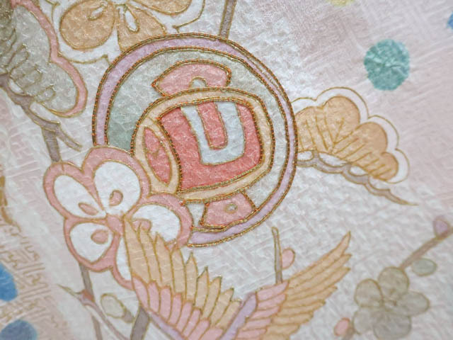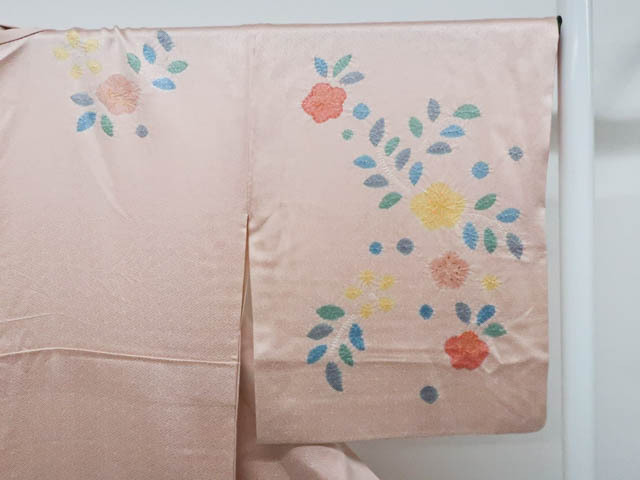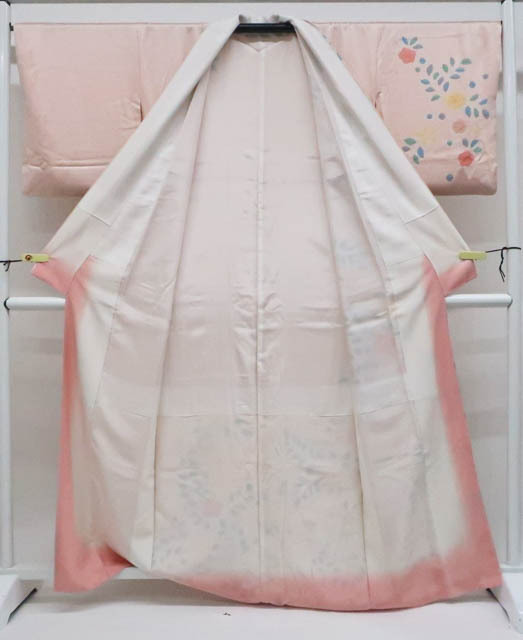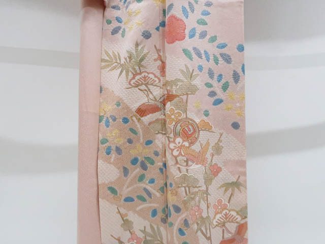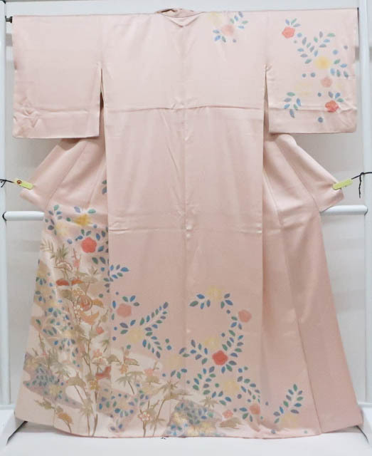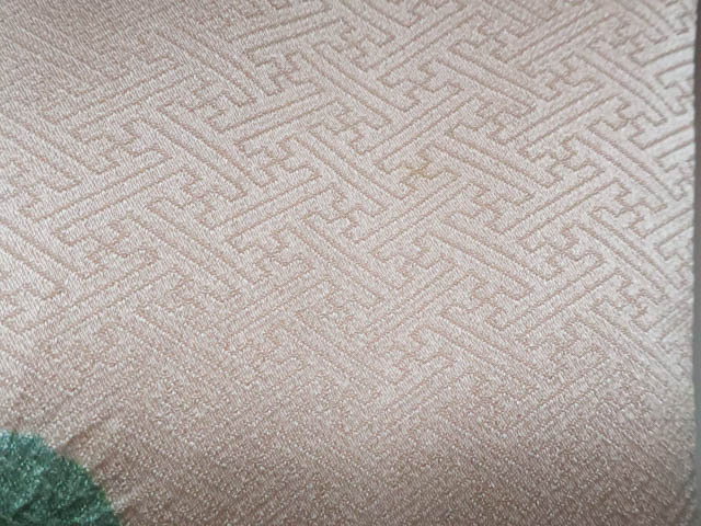 リサイクル商品のため、左袖前、右衿に薄汚れがございますが着用可能なお品です。 地色は淡いピンクです。 1枚目の画像が近いお色かと思われます。 素材は正絹です。 |