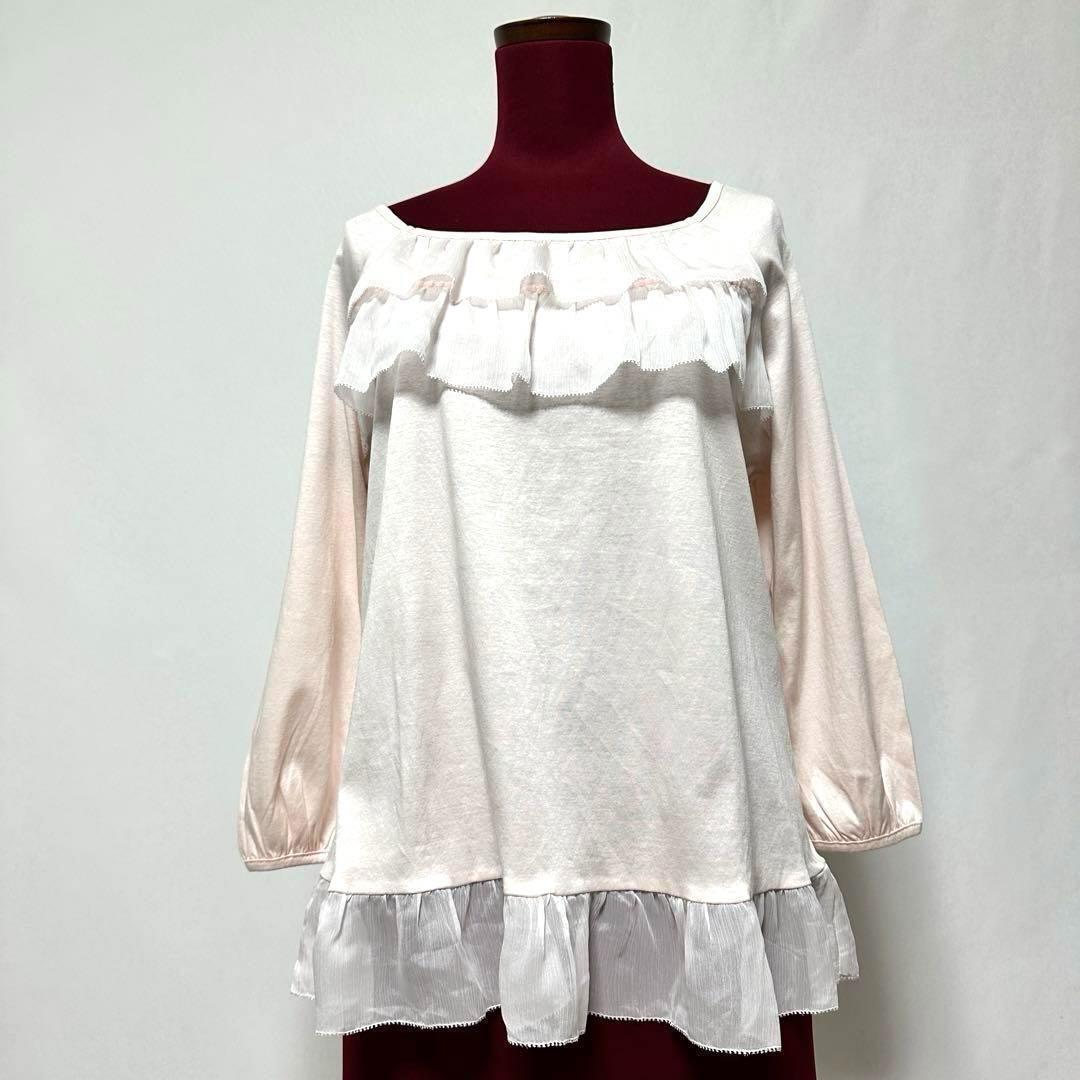 薄手でほんのり光沢感のある素材で、胸元と裾のフリルがとても可愛く、Aラインでスタイルカバーされるデザインです。