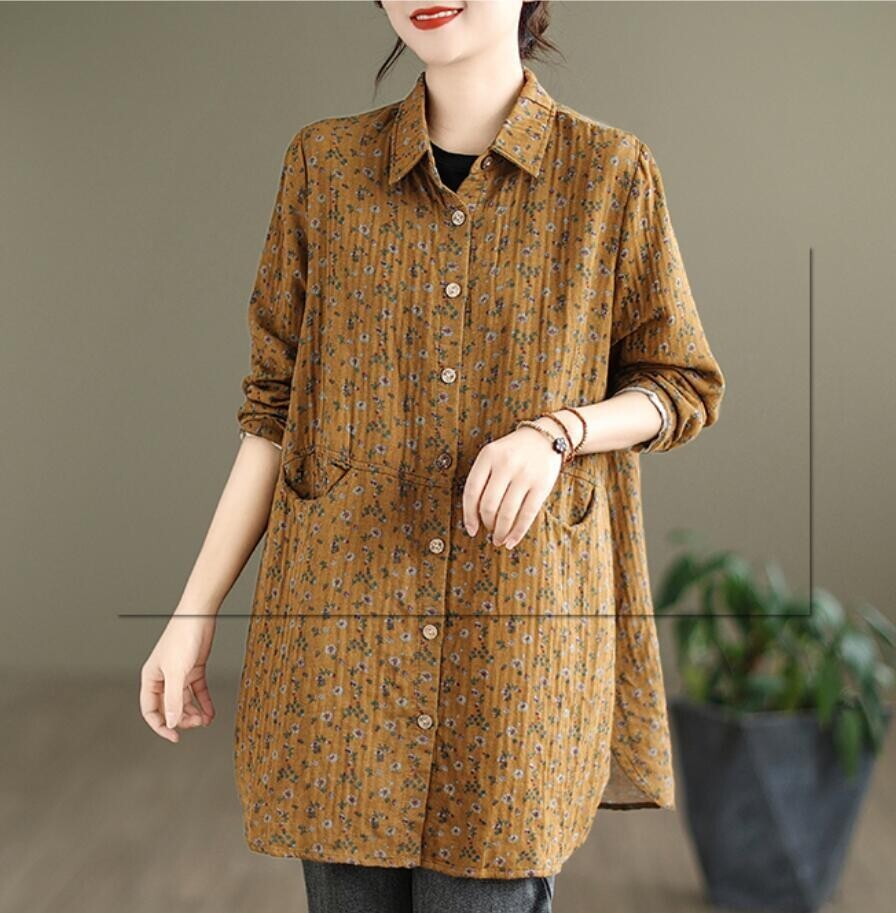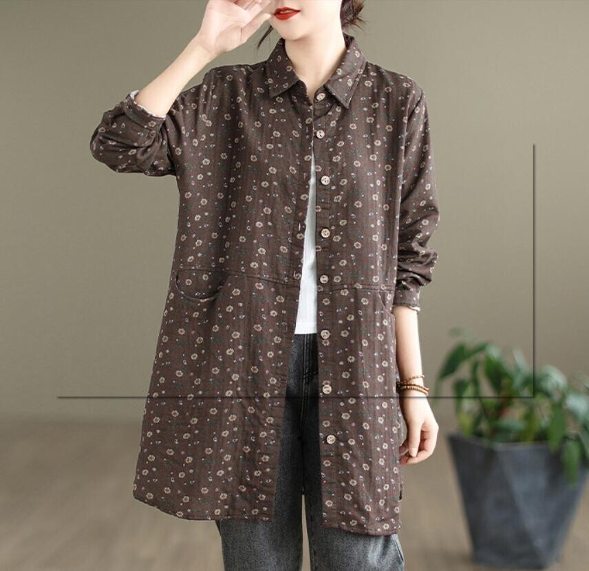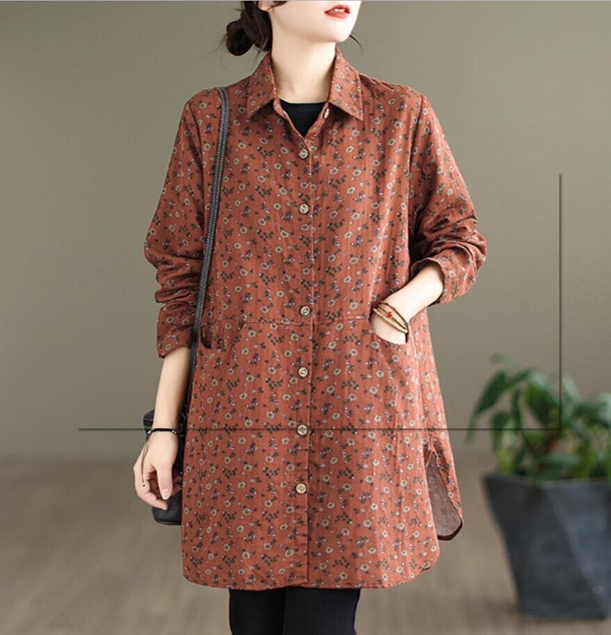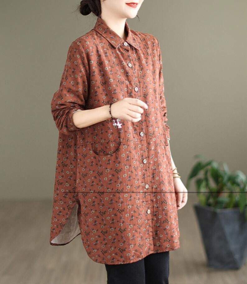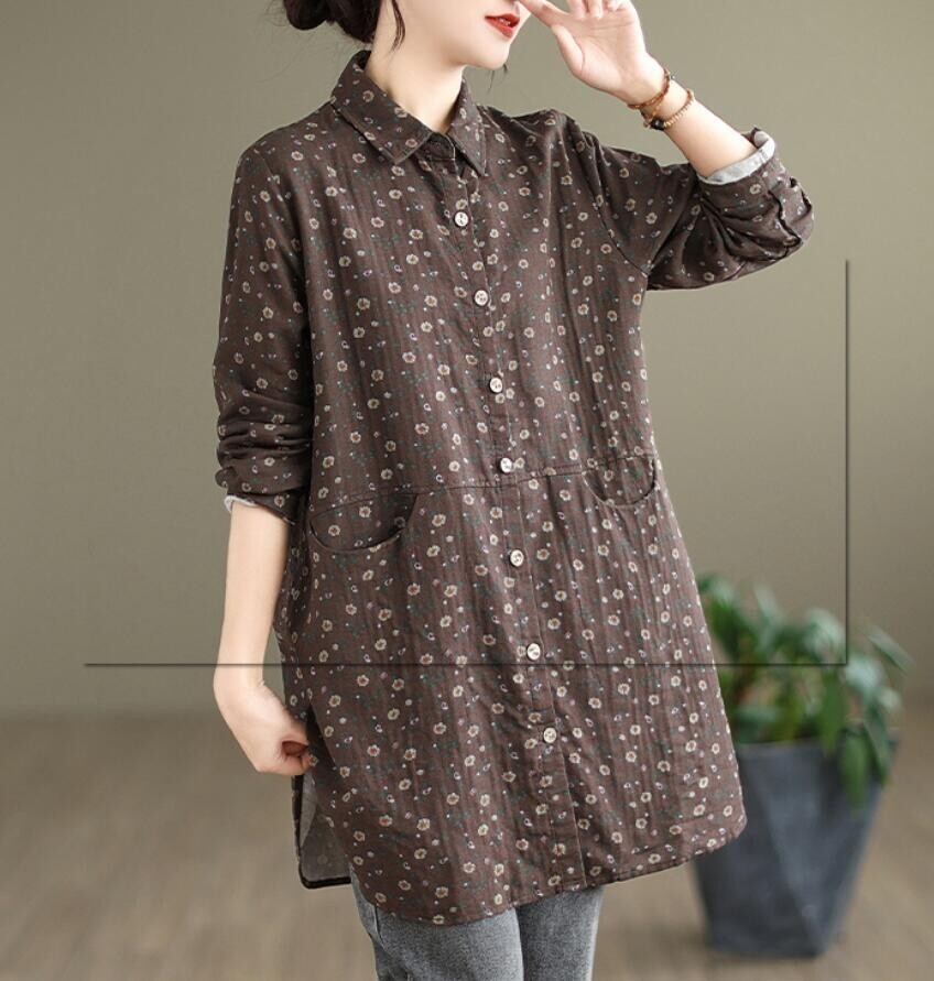 新品 秋 冬 カジュアル シャツ チュニック 小花柄 ロング ブラウス 長袖 襟付き 上品 大人 ロングシャツ レディースコーヒー