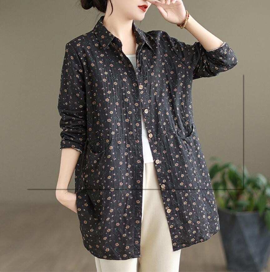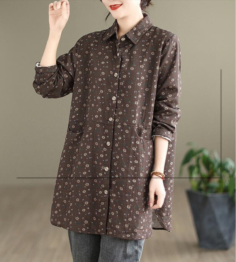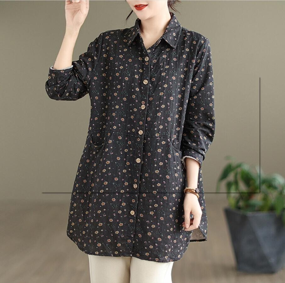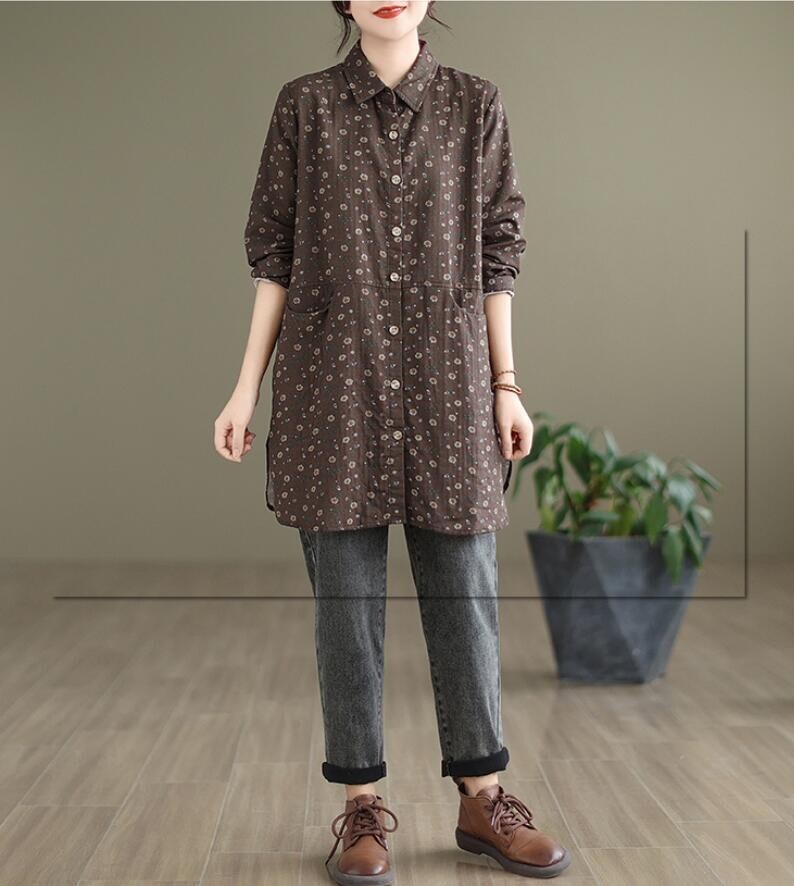 新品 秋 冬 カジュアル シャツ チュニック 小花柄 ロング ブラウス 長袖 襟付き 上品 大人 ロングシャツ レディースコーヒー