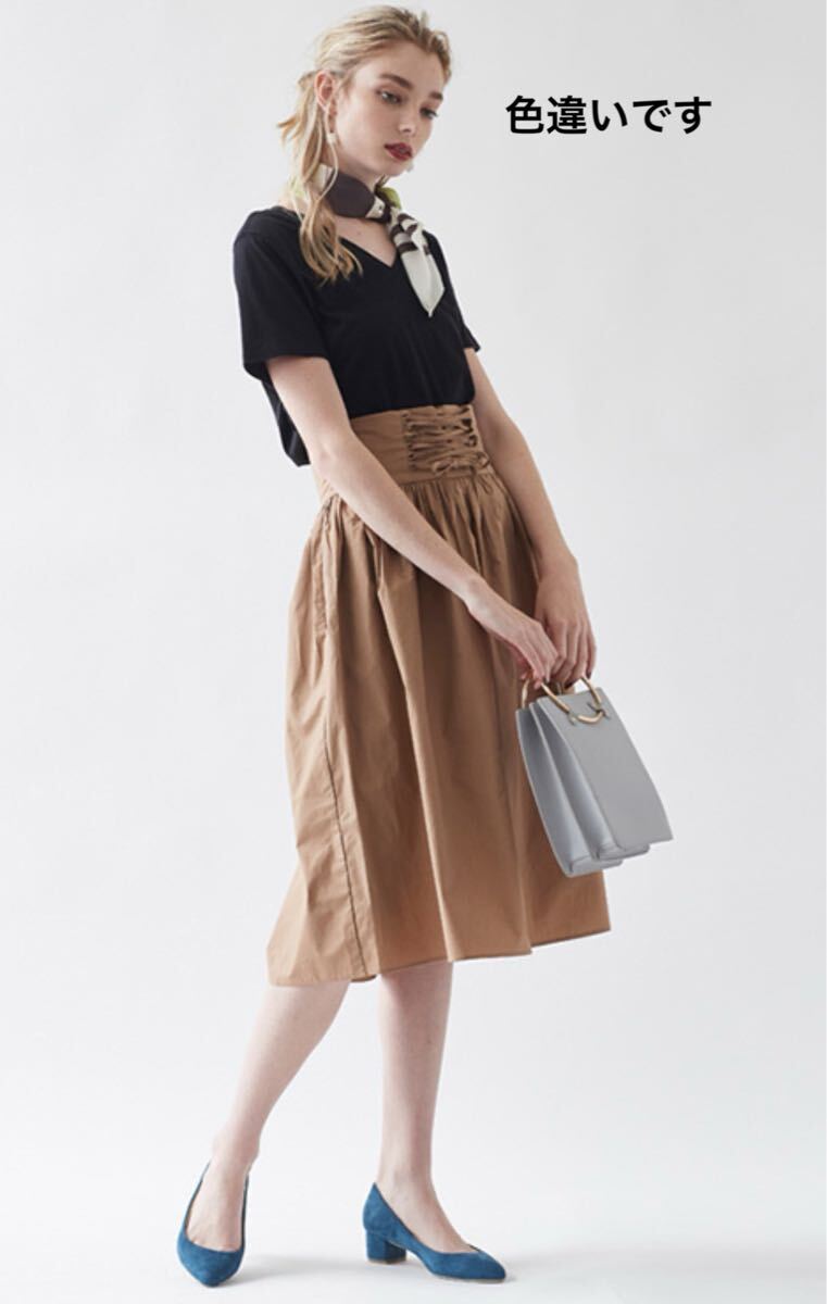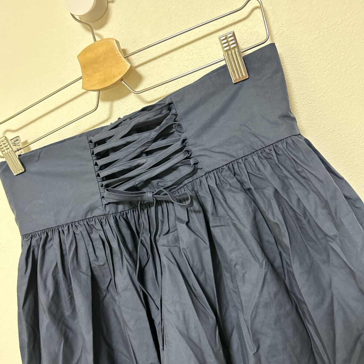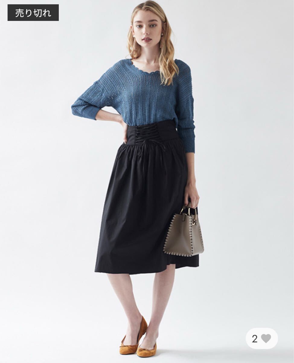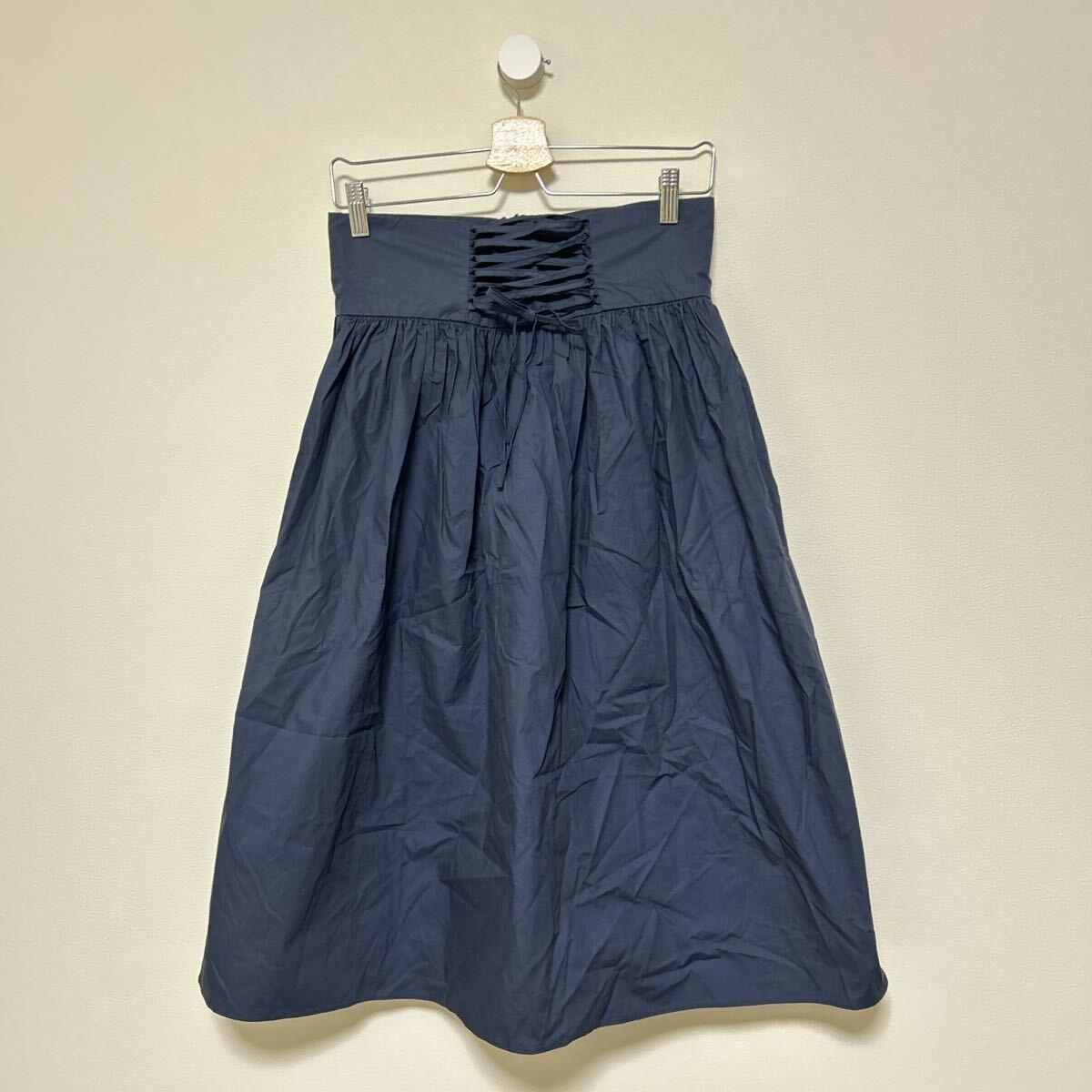 ネイビーのフレアスカート、レースアップウエストデザインがポイント。おしゃれで品のあるスタイル