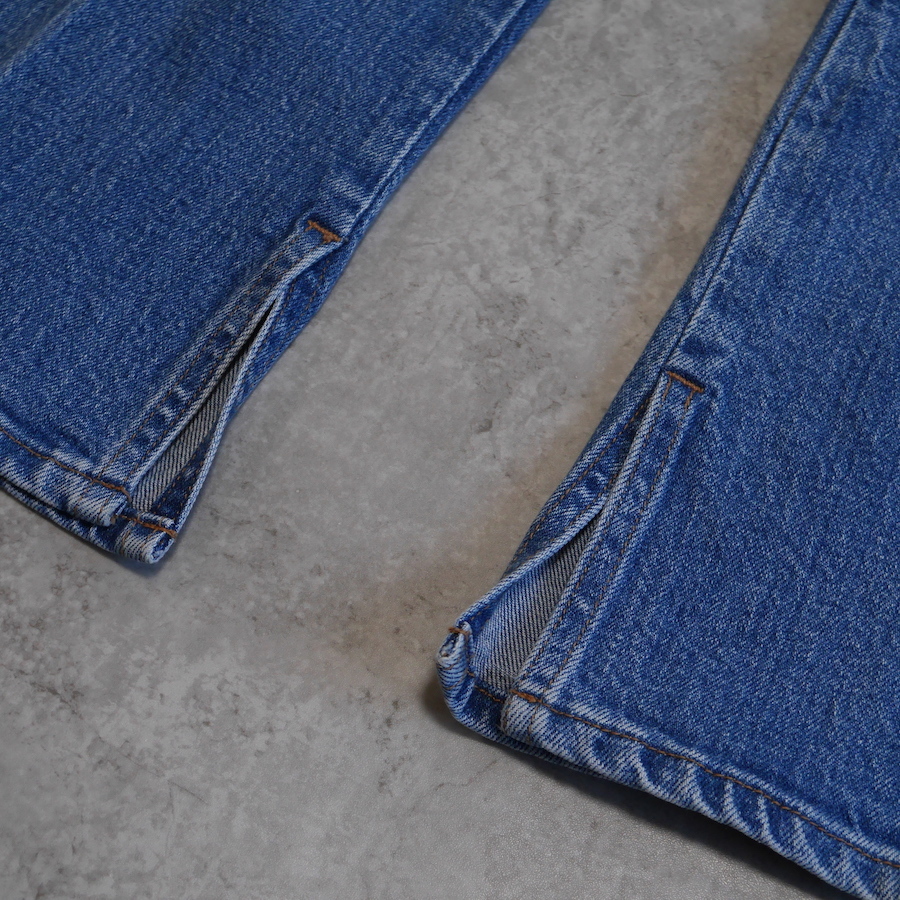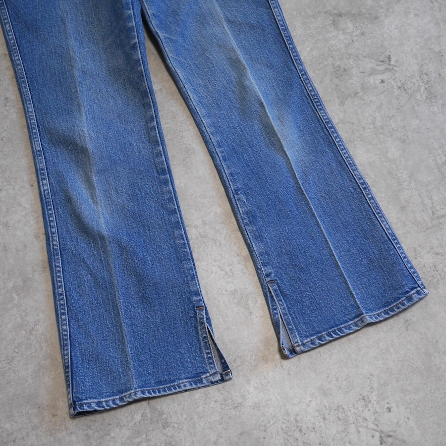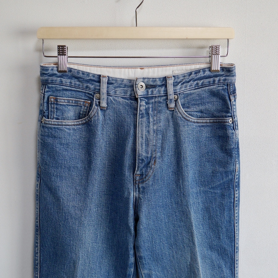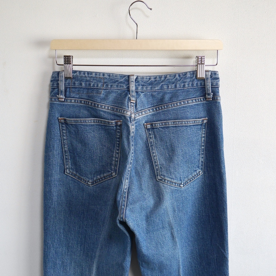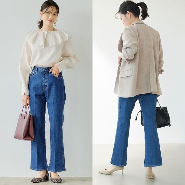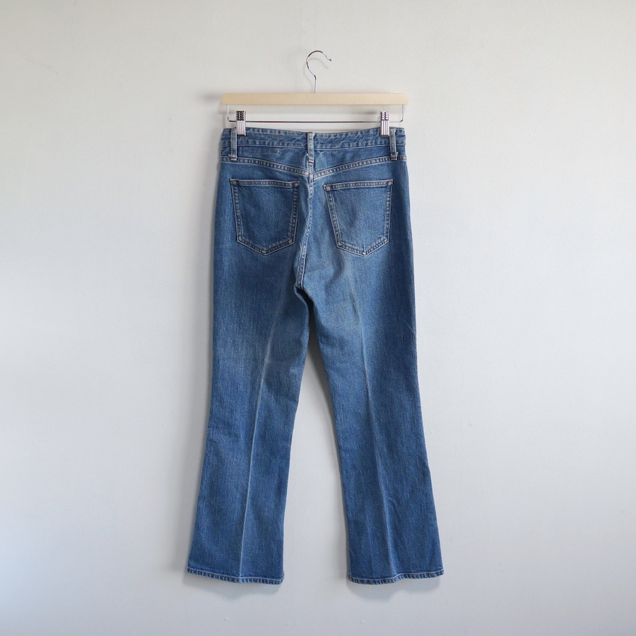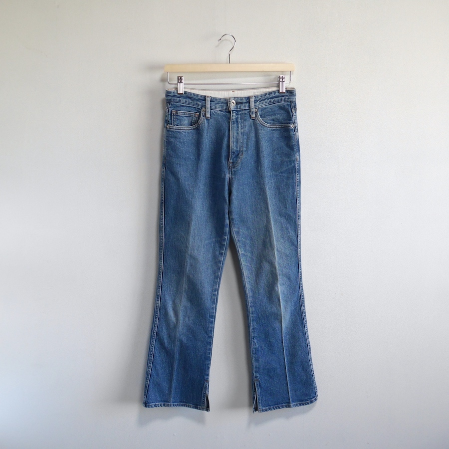 デザイン裾にかけてなだらかに広がるフレアシルエットが特徴のデニムパンツ。 腰周りがすっきり見えるよう、ウエスト位置やフィット感にこだわり、やや深めの股上×やや長めの丈に仕上げました。 裾のスリットがコーディネートにさりげない抜け感と軽やかさをプラスしてくれる大人のフレアデニムです。