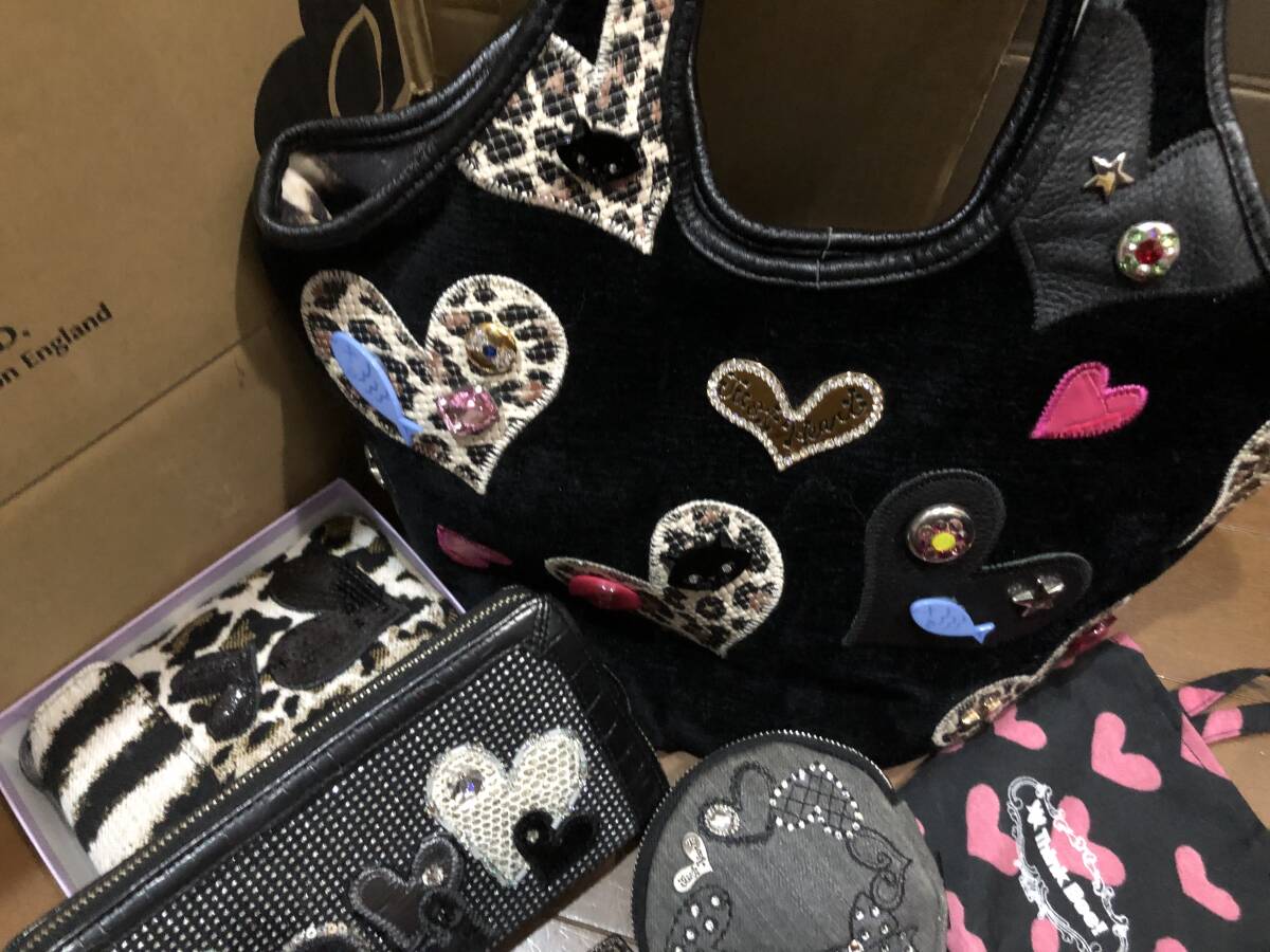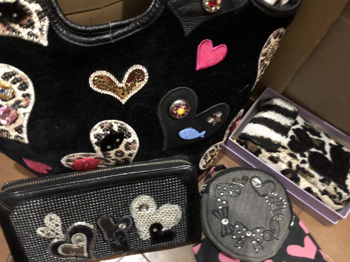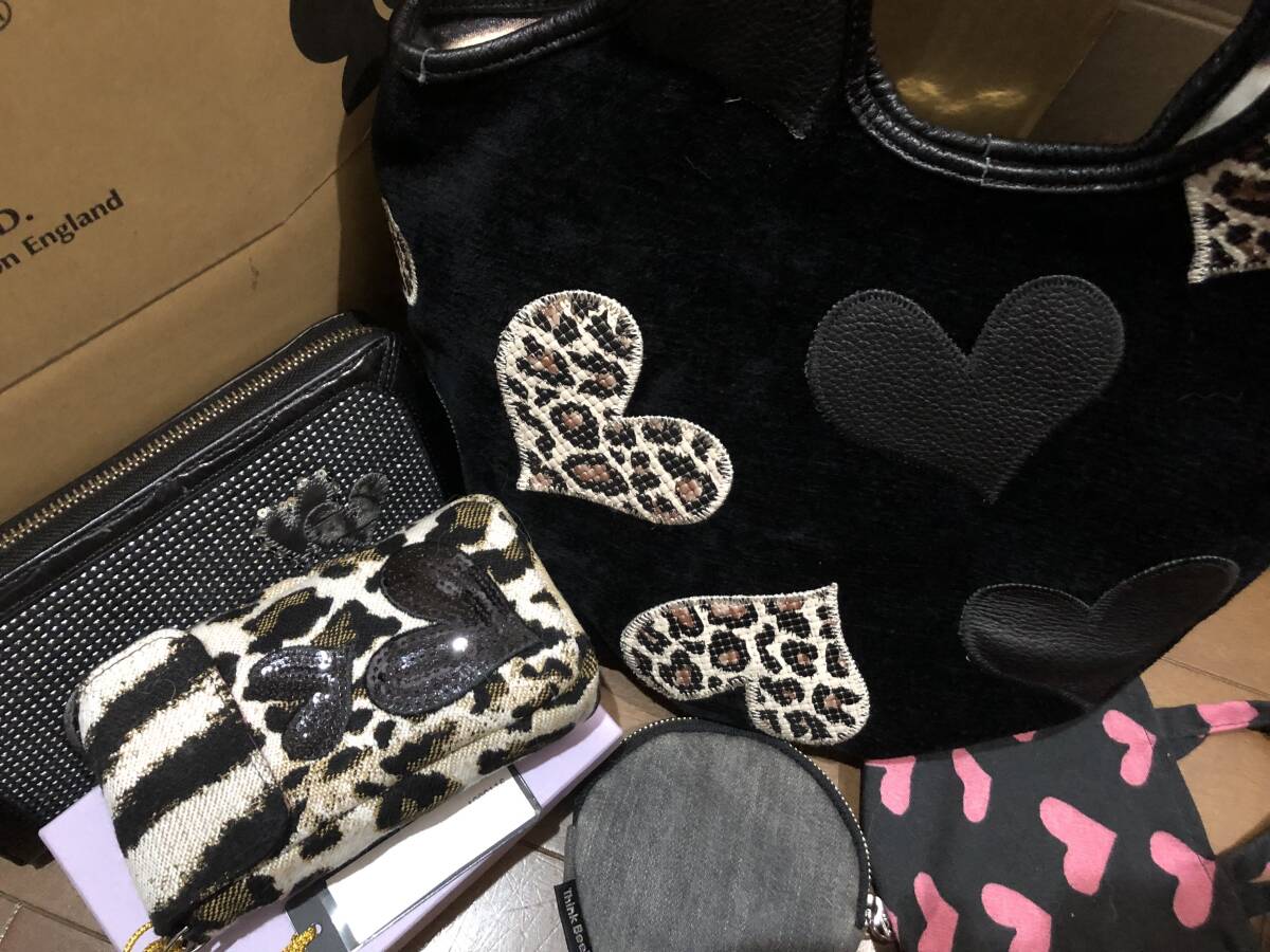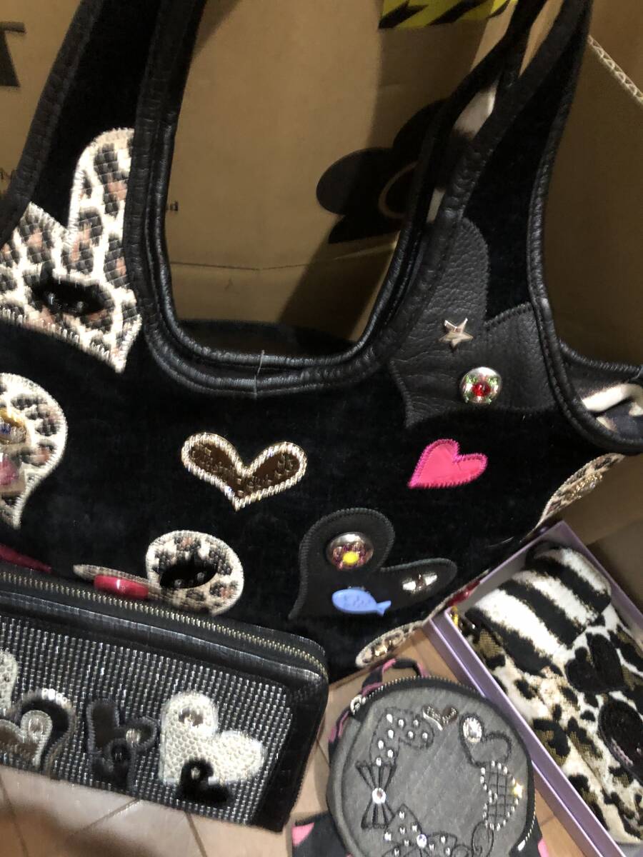 シンクビーの豪華5セットです。猫&魚&ハートパッチワーク柄バッグ1点、ハート柄長財布(内側は牛革)、ゼブラ柄ミニポーチ1点、グレー色リボンズミニポーチ1点、ミニ保存袋1点の全部で豪華5点です。