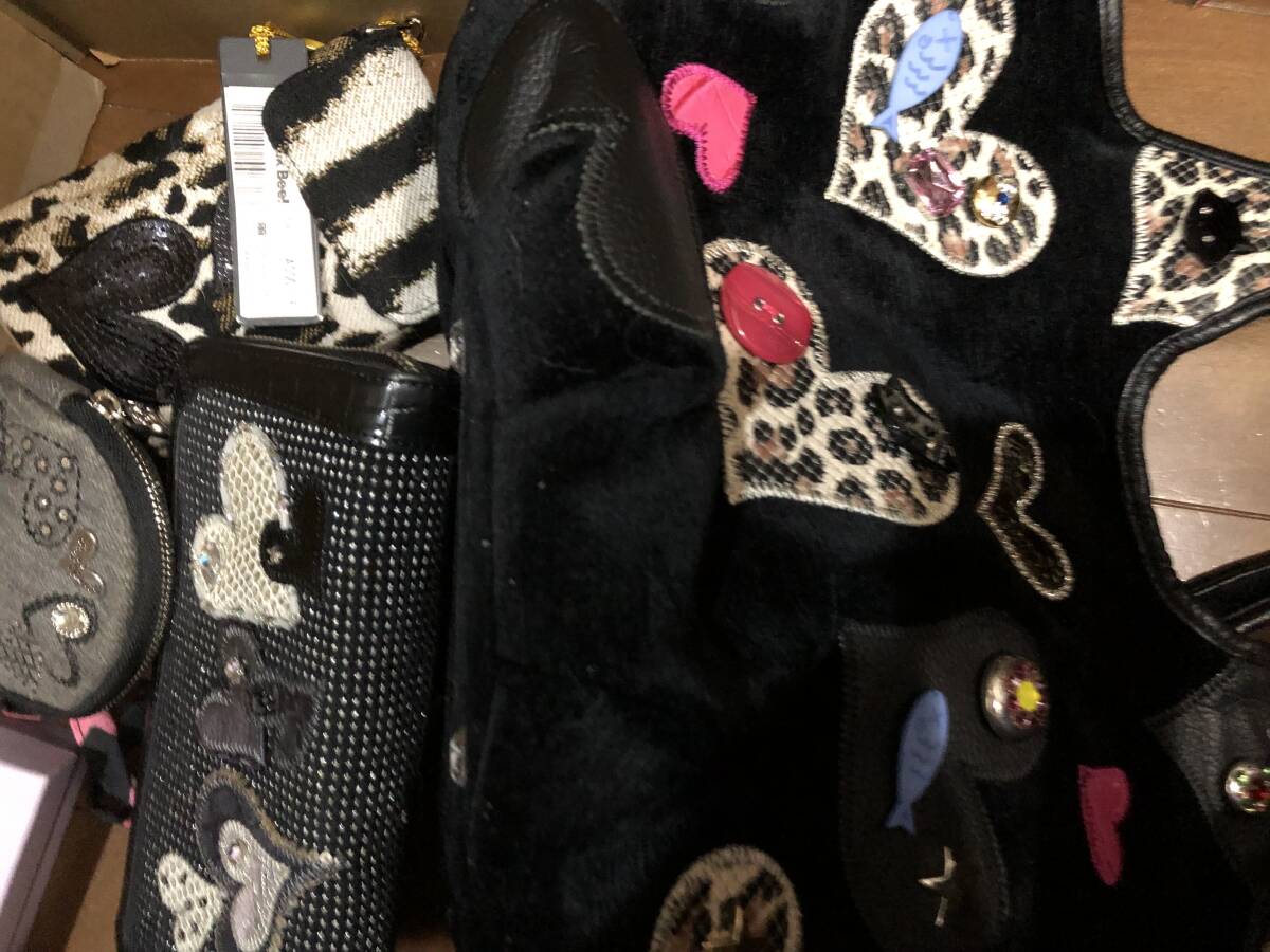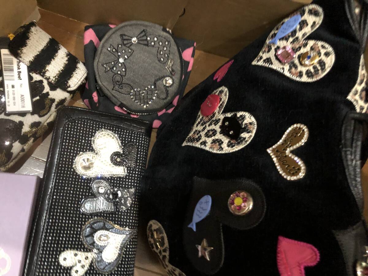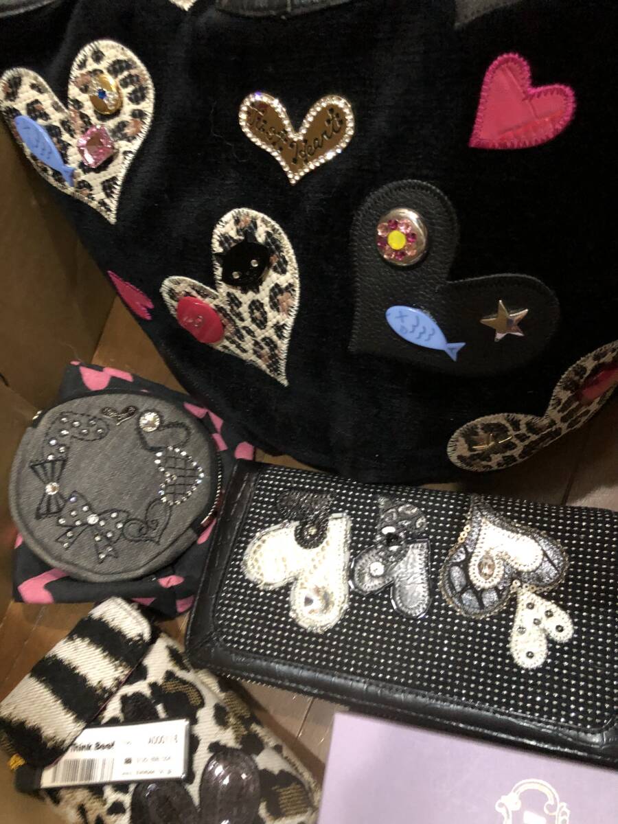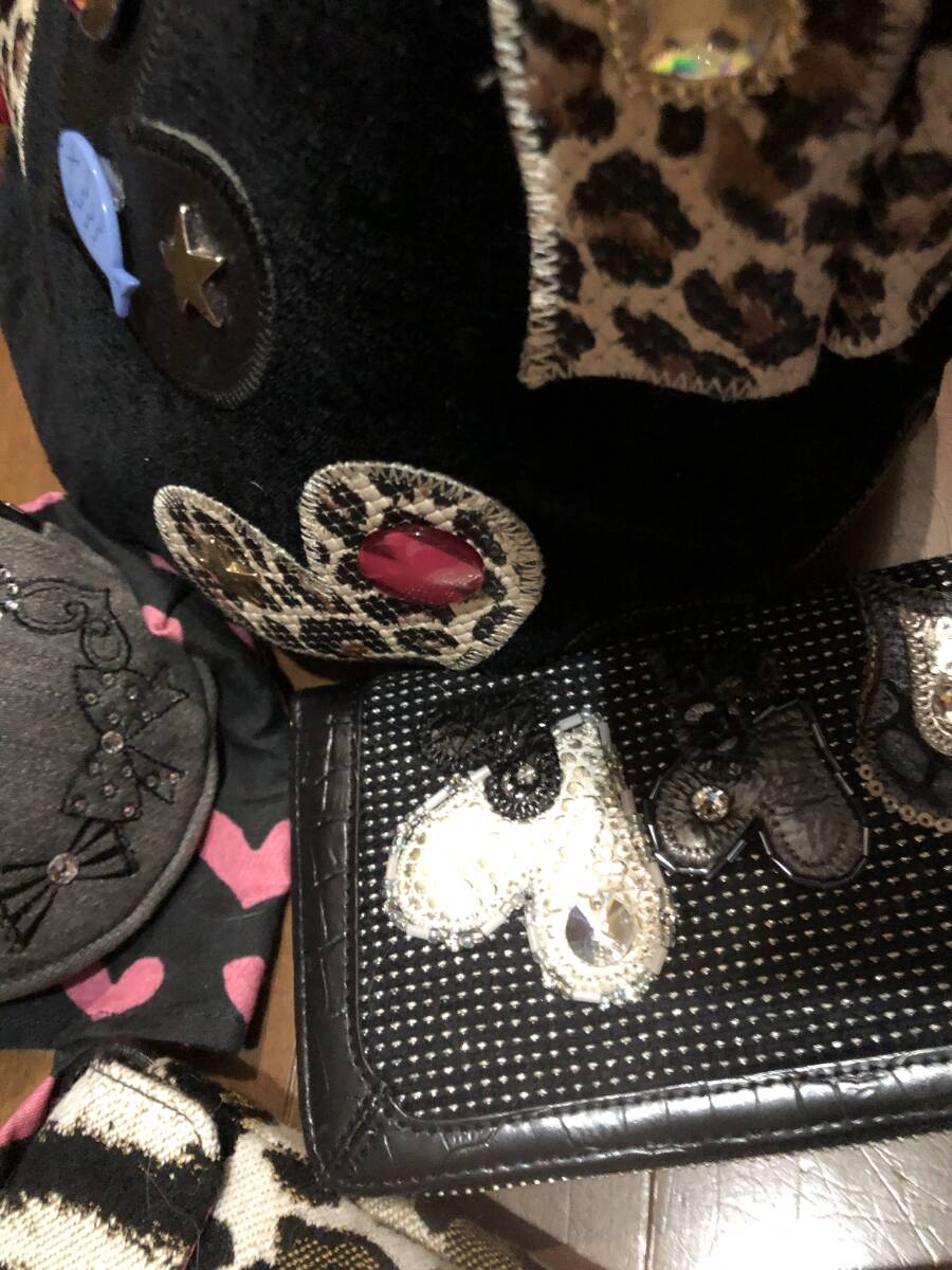 シンクビーの豪華5セットです。猫&魚&ハートパッチワーク柄バッグ1点、ハート柄長財布(内側は牛革)、ゼブラ柄ミニポーチ1点、グレー色リボンズミニポーチ1点、ミニ保存袋1点の全部で豪華5点です。