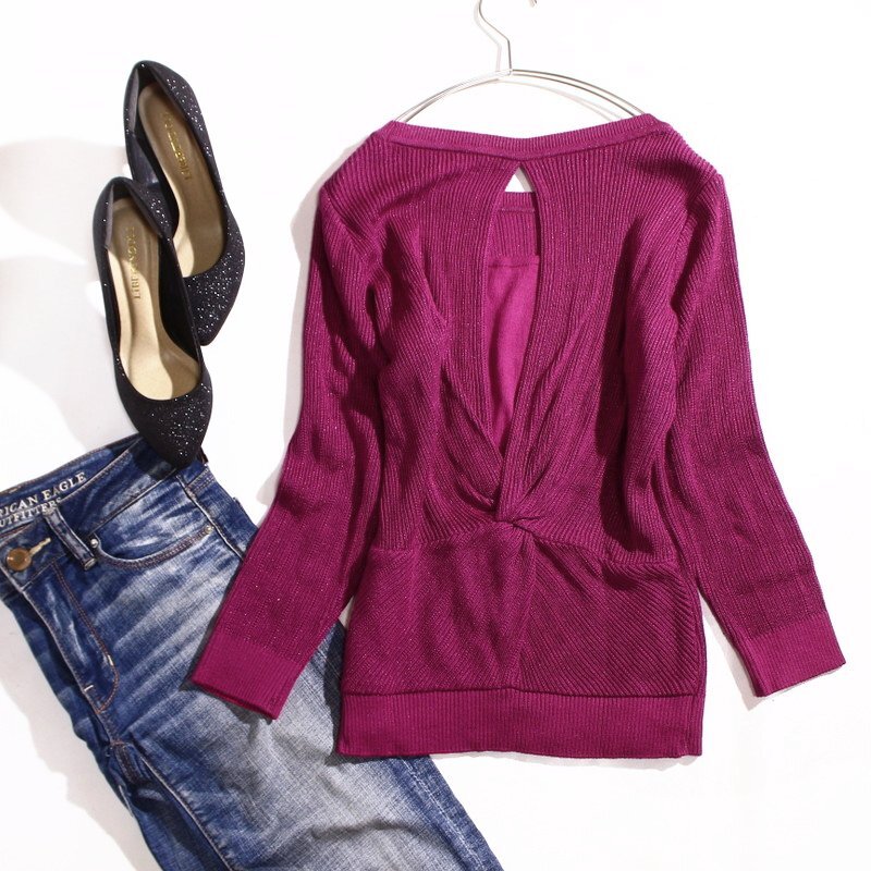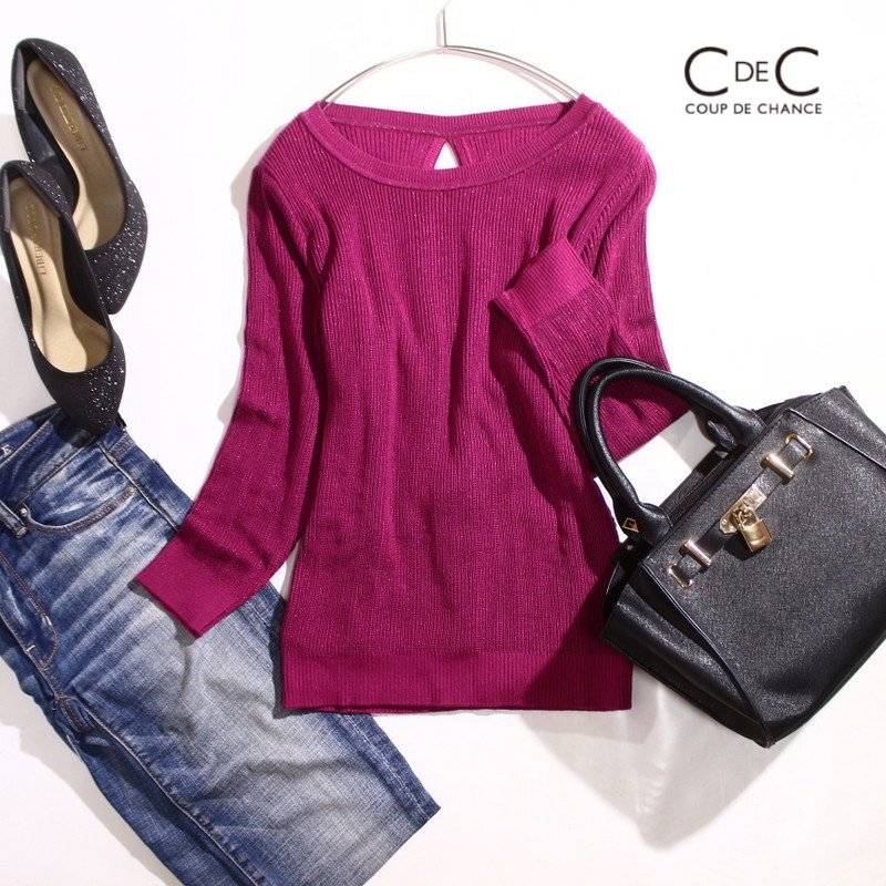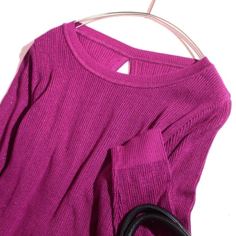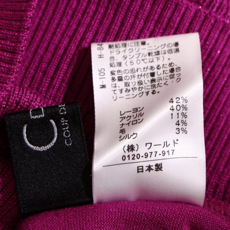 美品 クードシャンス COUP DE CHANCE 株) ワールド 綺麗色 上品 デザイン 長袖 ニットカットソー 9号 38 マゼンタ フェイクレイヤード ラメ