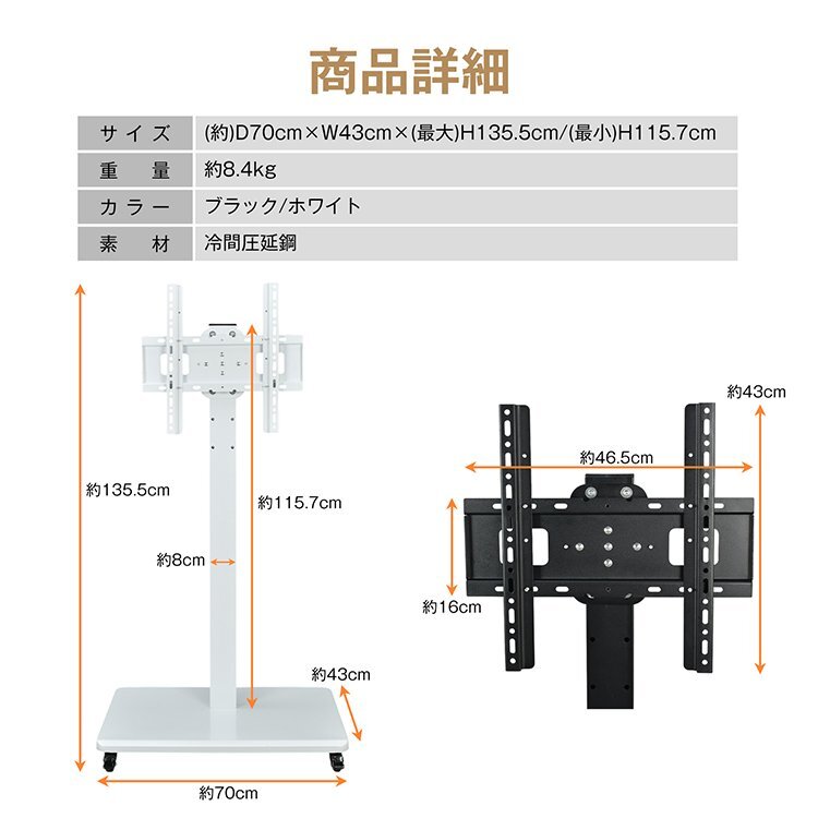 【サイズ】:(約)W70cm×D43cm×(最大)H135.5cm/(最小)115.7cm