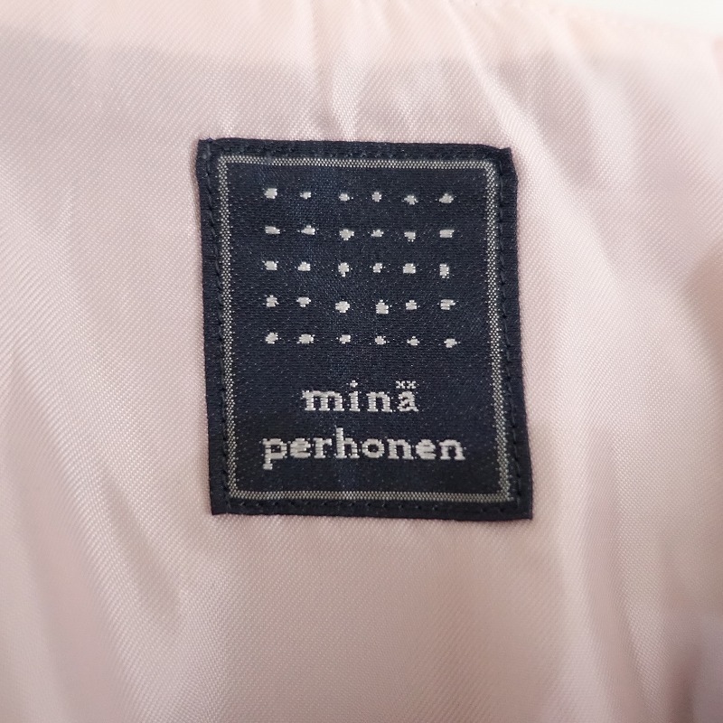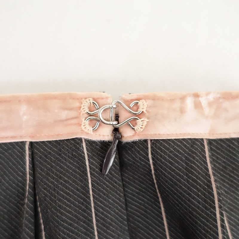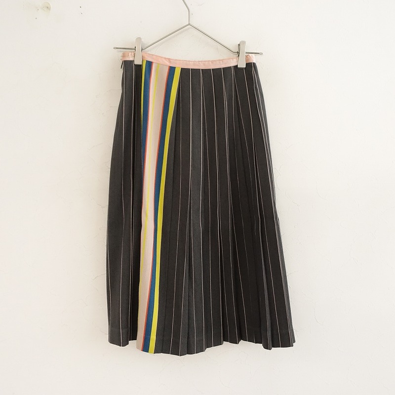 mina perhonenのmultistripe マルチストライププリーツスカートです。カラーはチャコールグレー・ピンクベージュ・イエロー・ターコイズ・オレンジのマルチストライプ織地で仕立てられており、裏地が付いております。ウエストはピンクのベルベットテープが施されており、プリーツ入り、左腰のフック&ファスナー開閉で着脱できます。 |
