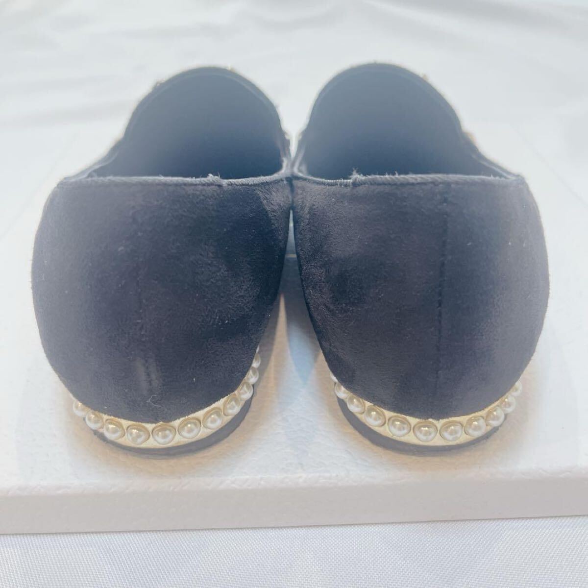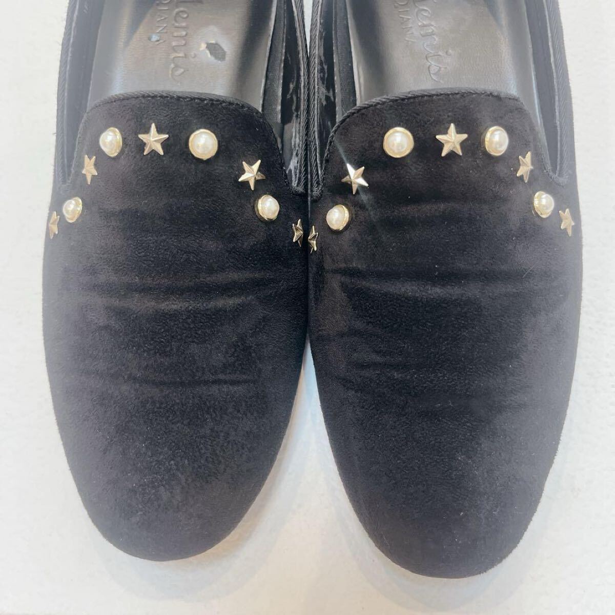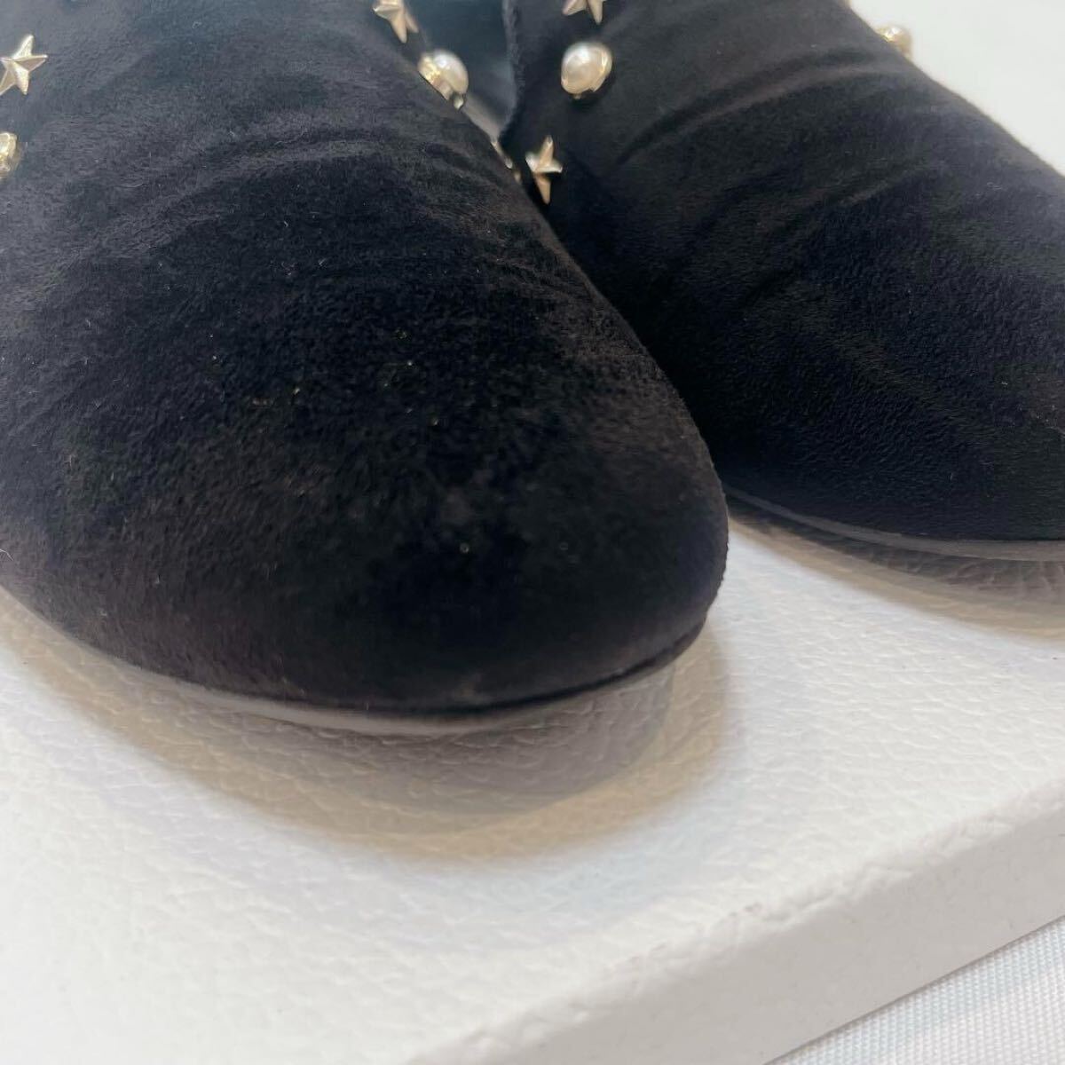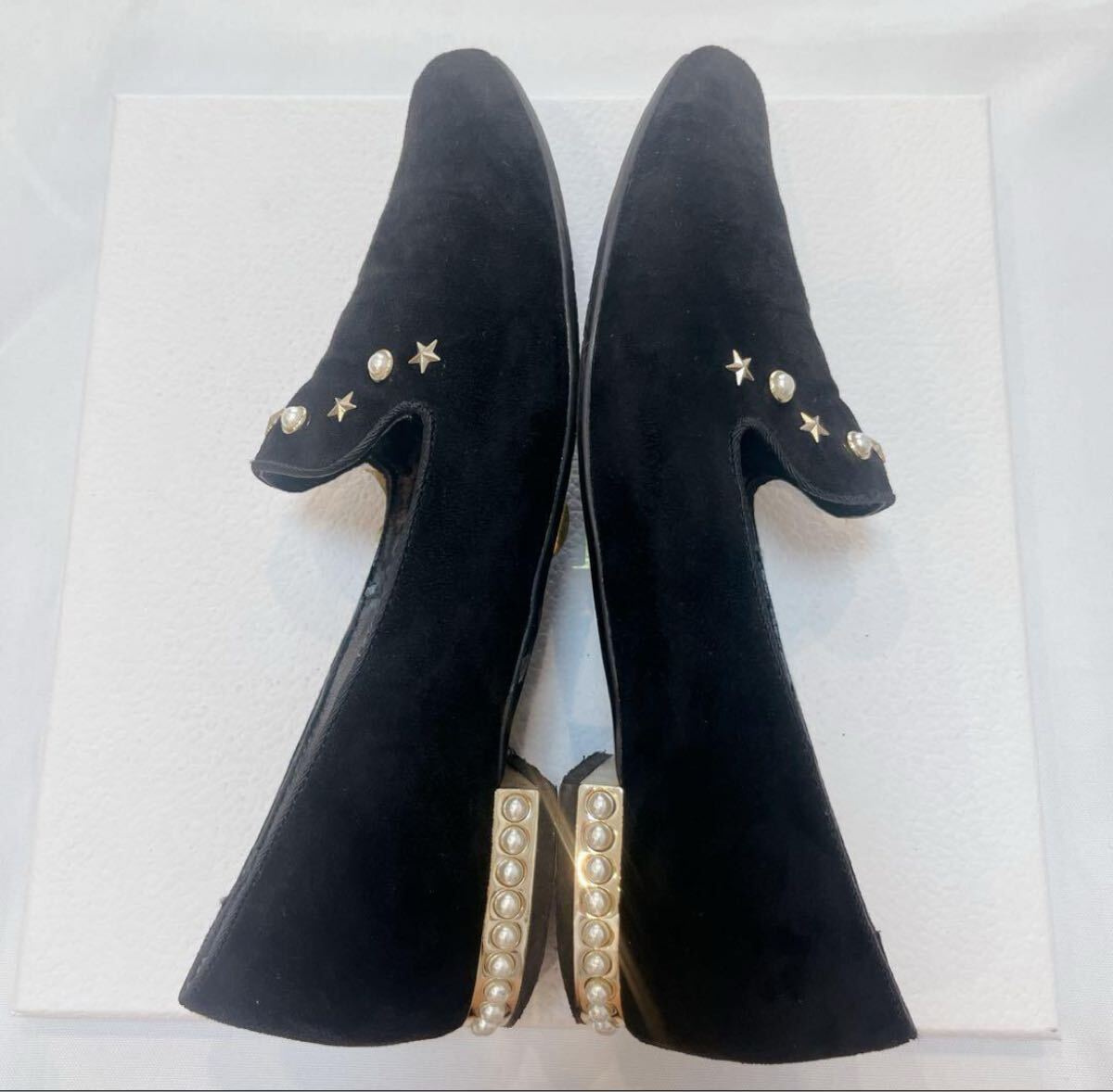 ブラックのスエード調素材に、星型スタッズとパールがあしらわれた上品で可愛いデザイン。かかと部分にもパールが並び、後ろ姿まで華やかさを演出してくれます。ヒールが低く歩きやすいので、普段使いやお出かけ、パーティーにもおすすめです。
