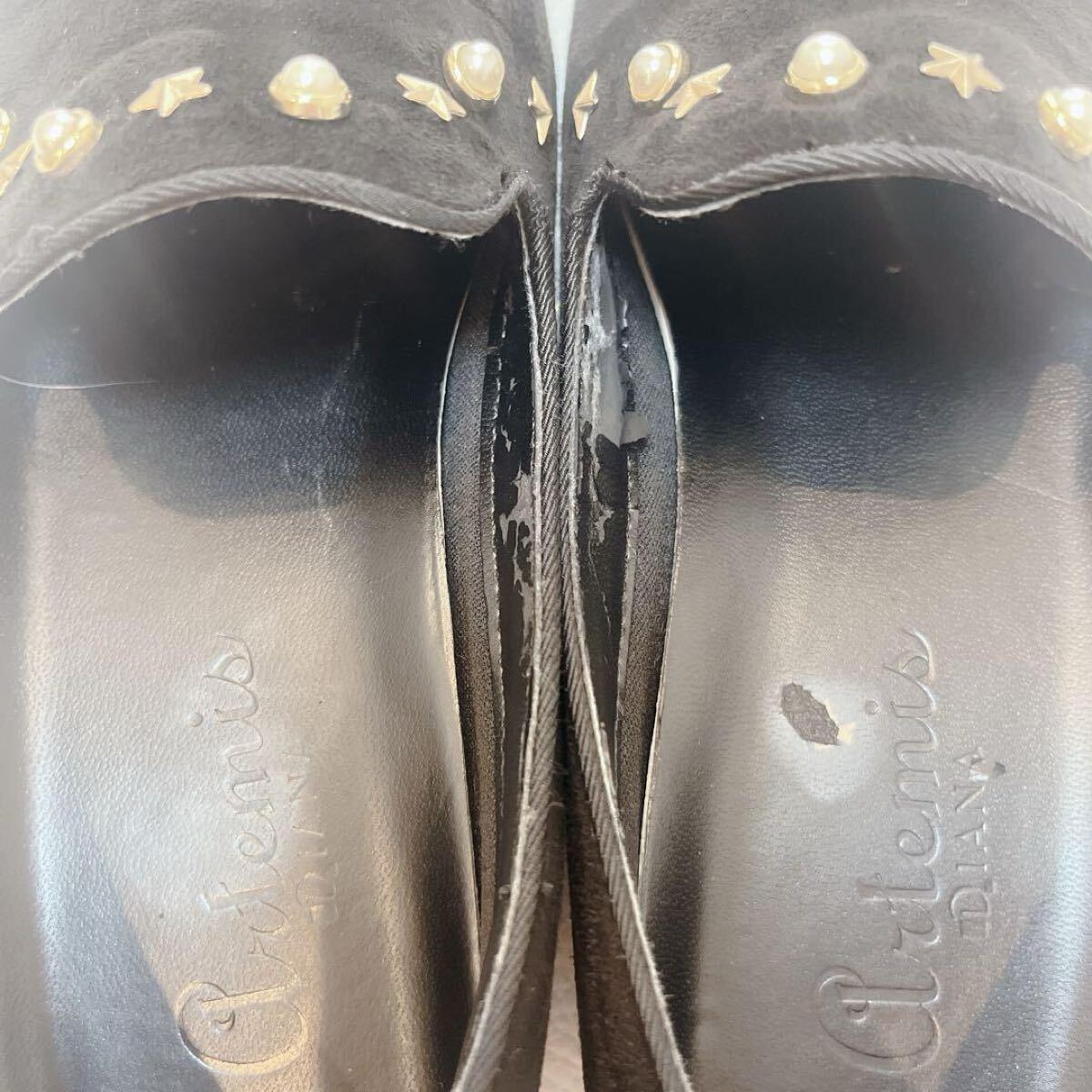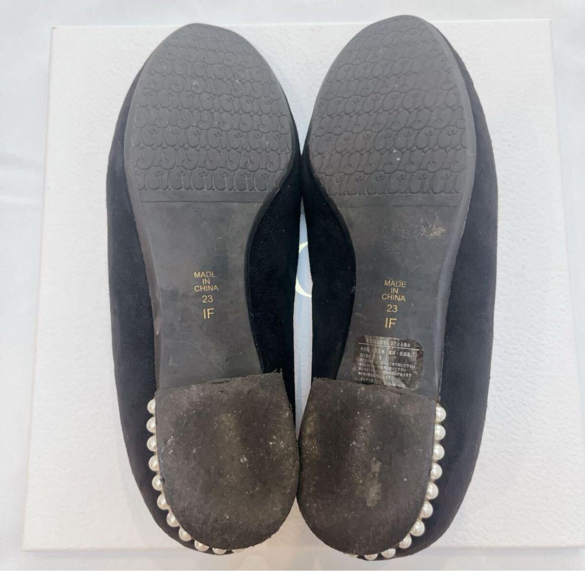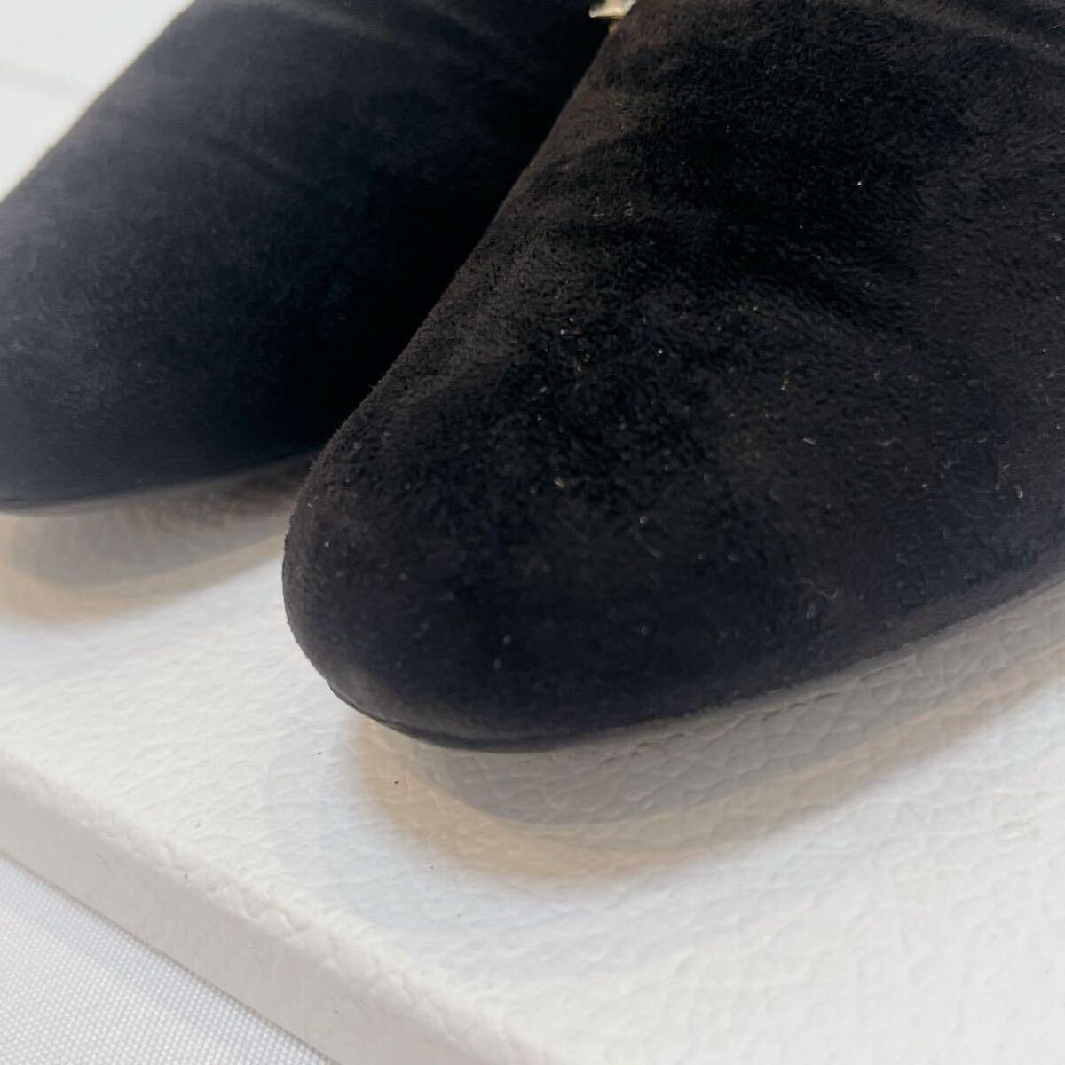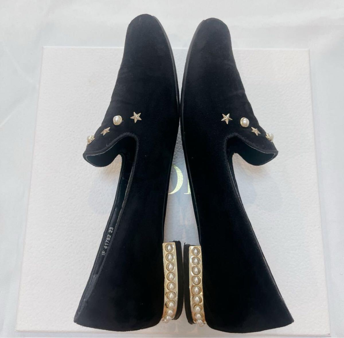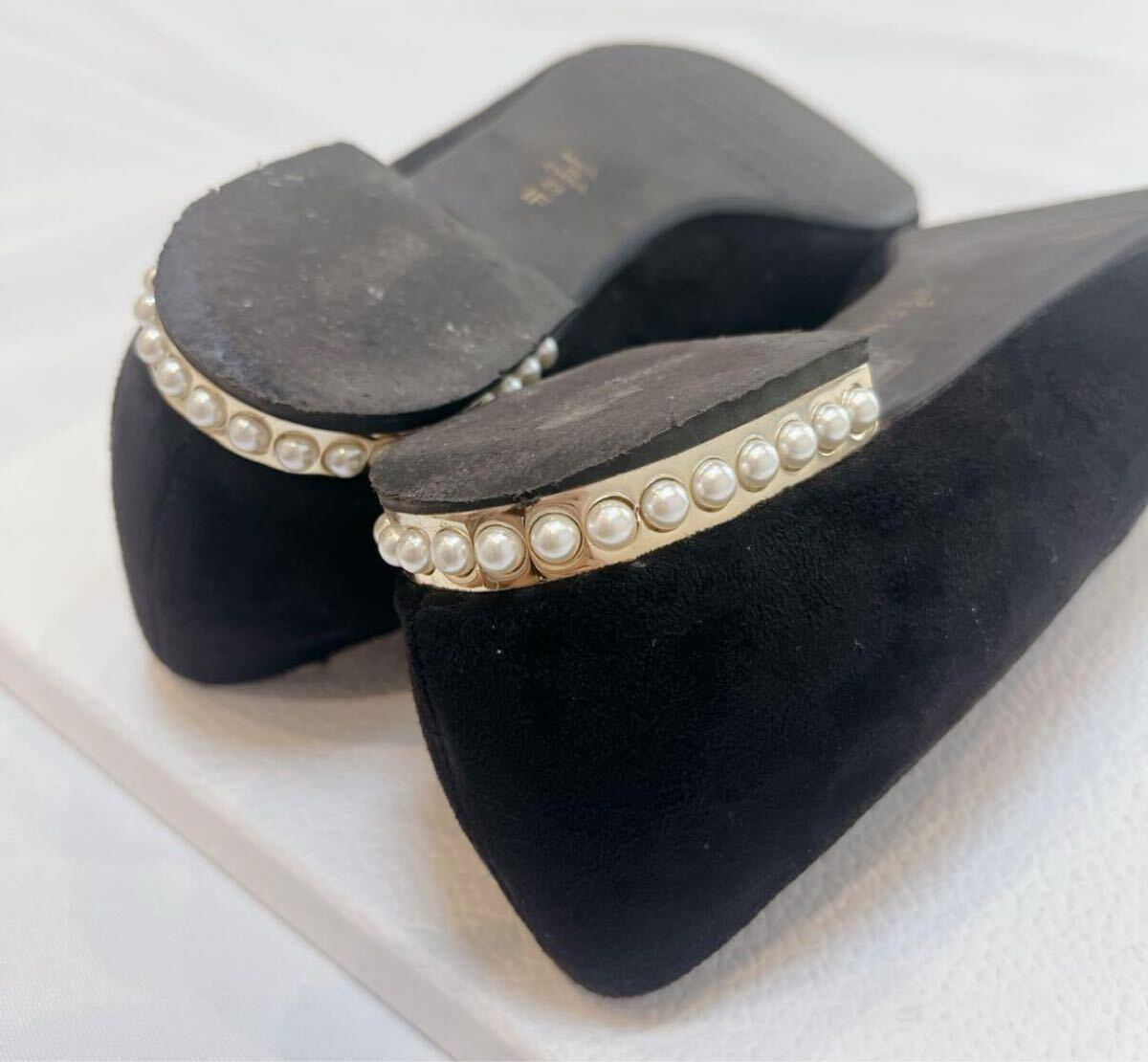ブラックのスエード調素材に、星型スタッズとパールがあしらわれた上品で可愛いデザイン。かかと部分にもパールが並び、後ろ姿まで華やかさを演出してくれます。ヒールが低く歩きやすいので、普段使いやお出かけ、パーティーにもおすすめです。