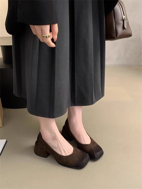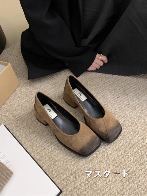 パンプス オールシーズン シングルシューズ 太いヒール スクエアトゥ レディースシューズ 【35】22.5cm マスタード