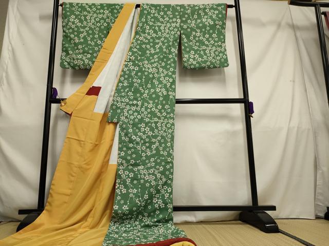 身丈 215cm(肩から) 裄丈 69.5cm 袖丈 49cm 縫込み3cm 袖幅 33.5cm 前幅 25cm 後幅 30.5cm 着物縫いこみ 内揚げ 0cm 裄お袖側 約2cm 身頃側 約0cm 《 サイズについてはこちら 》 |