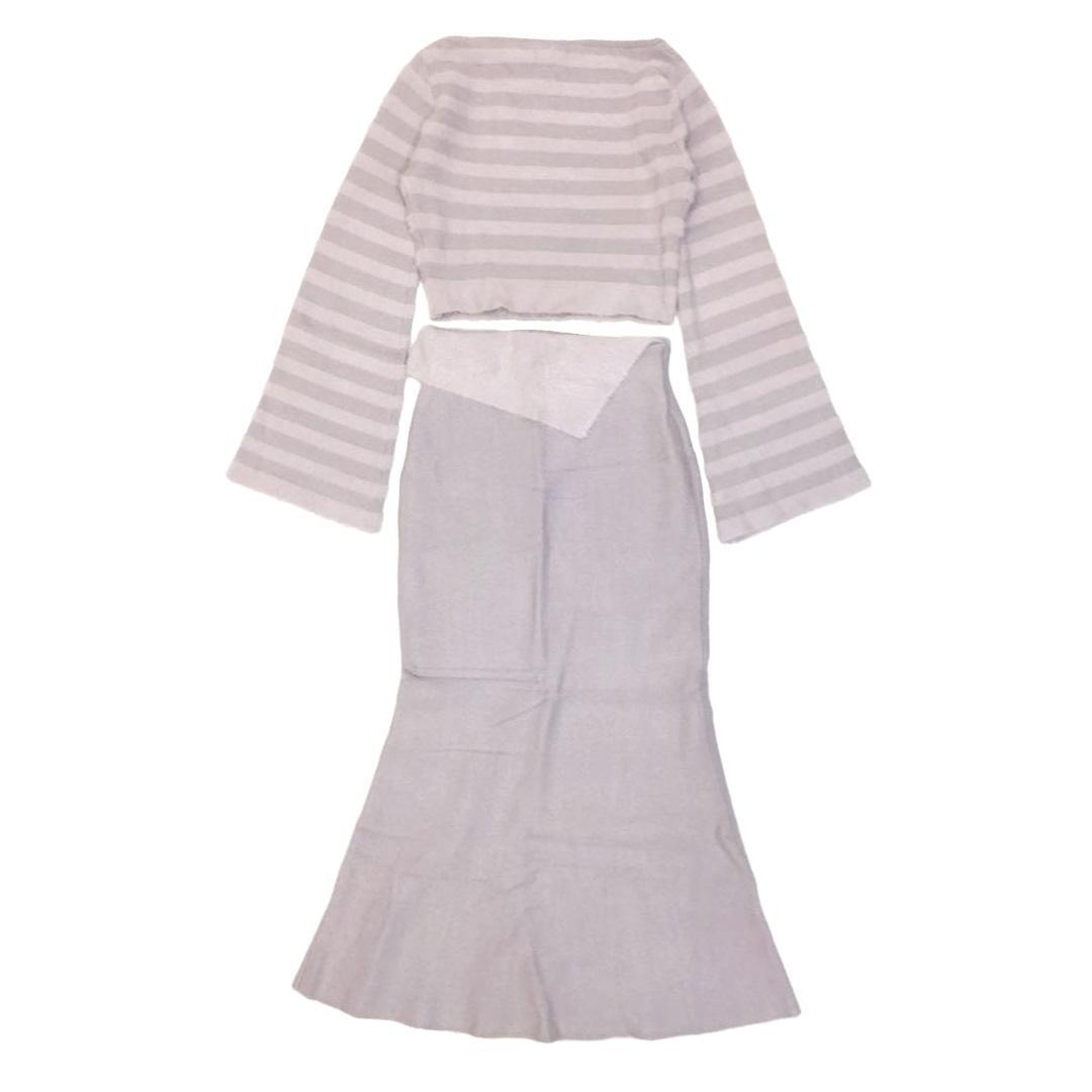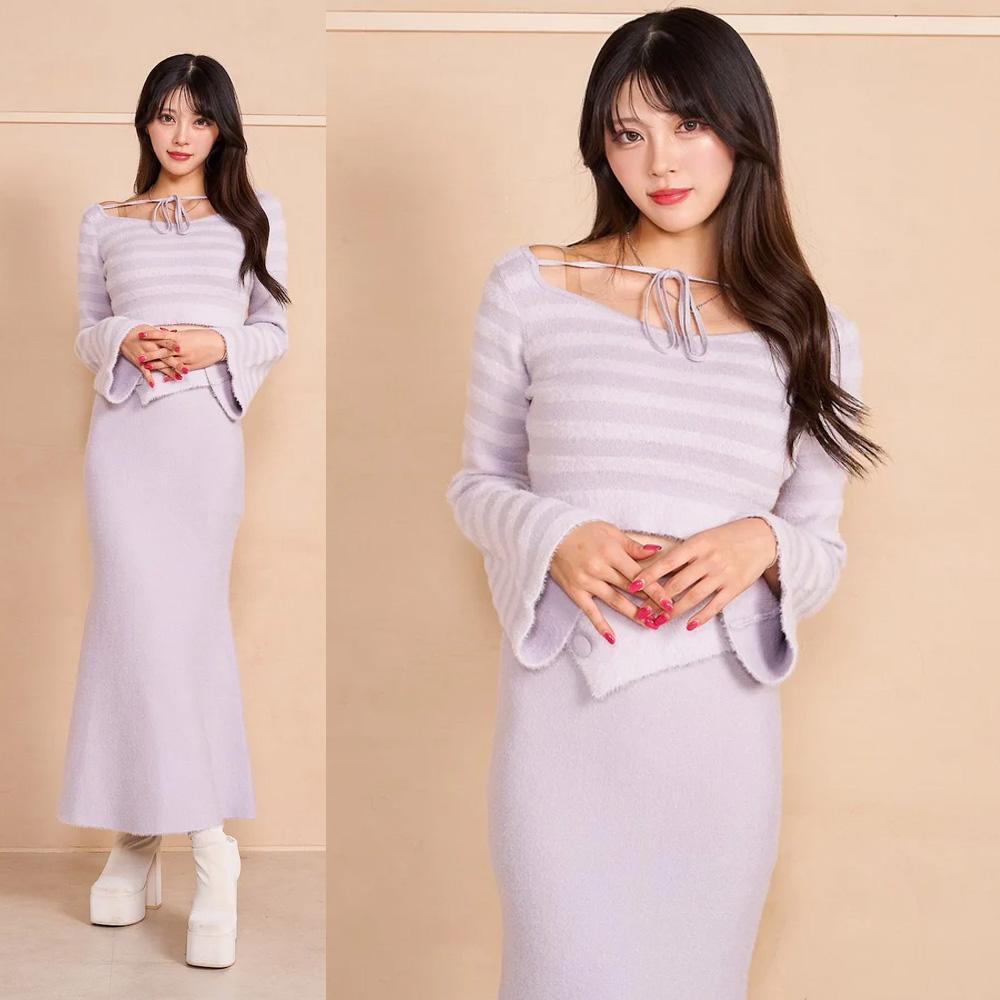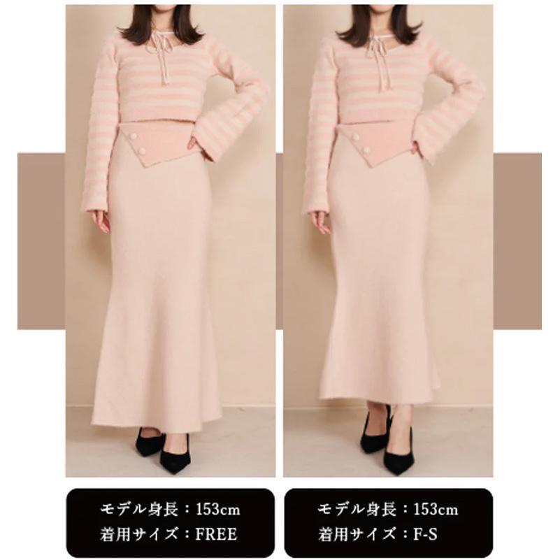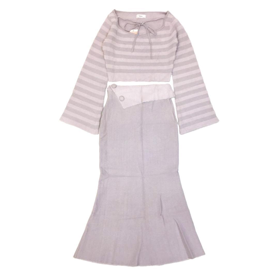ボーダー見えするトップスと、ウエスト部分に施された折り返しのデザインが印象的なマーメイドスカートの2点セットで、合わせ方次第でさまざまなスタイリングがお楽しみいただけます♪
