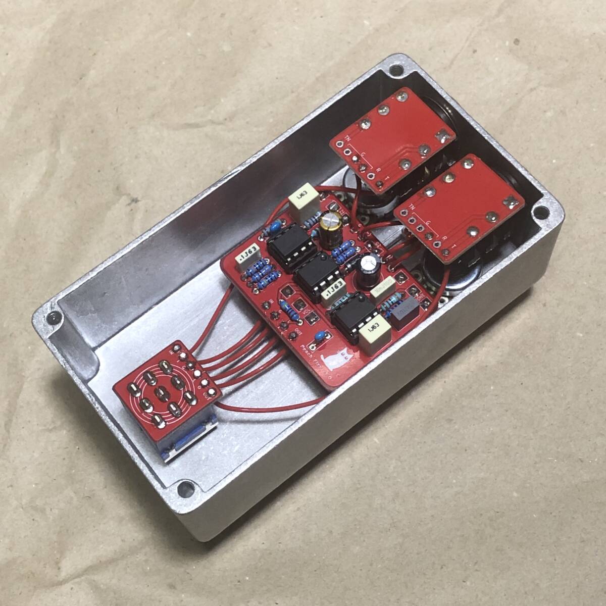 Fuzzといえばトランジスタ等を使ったディスクリート回路が多いですが、これはIC仕様です。TL2262というオペアンプとLM386というパワーアンプICを使っています。LM386はミニアンプ等でよく使われますが、エフェクターでも意外と使われることがあります。このLM386を2段で増幅して歪ませFuzzサウンドが作られています。(LM386単体でも意外と良い感じで歪みます)