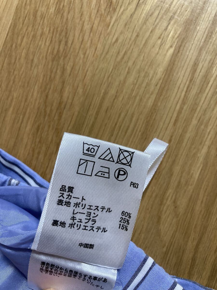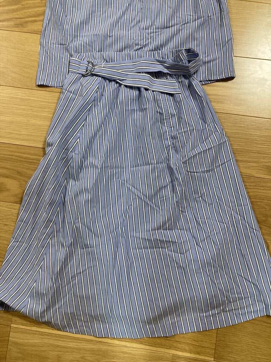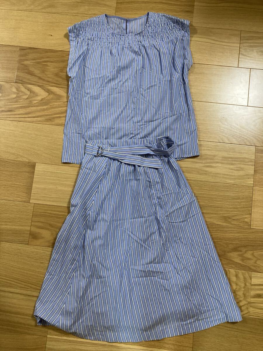 青と白のストライプのトップスとスカートのセットアップ、ウエストにベルト付きでスタイリッシュなセットアップです。