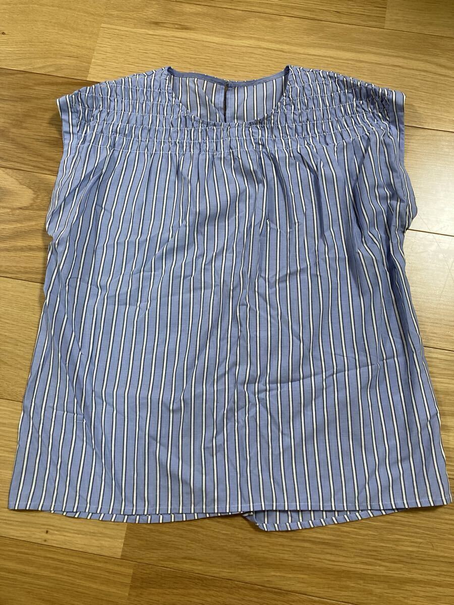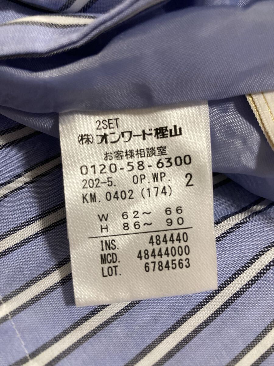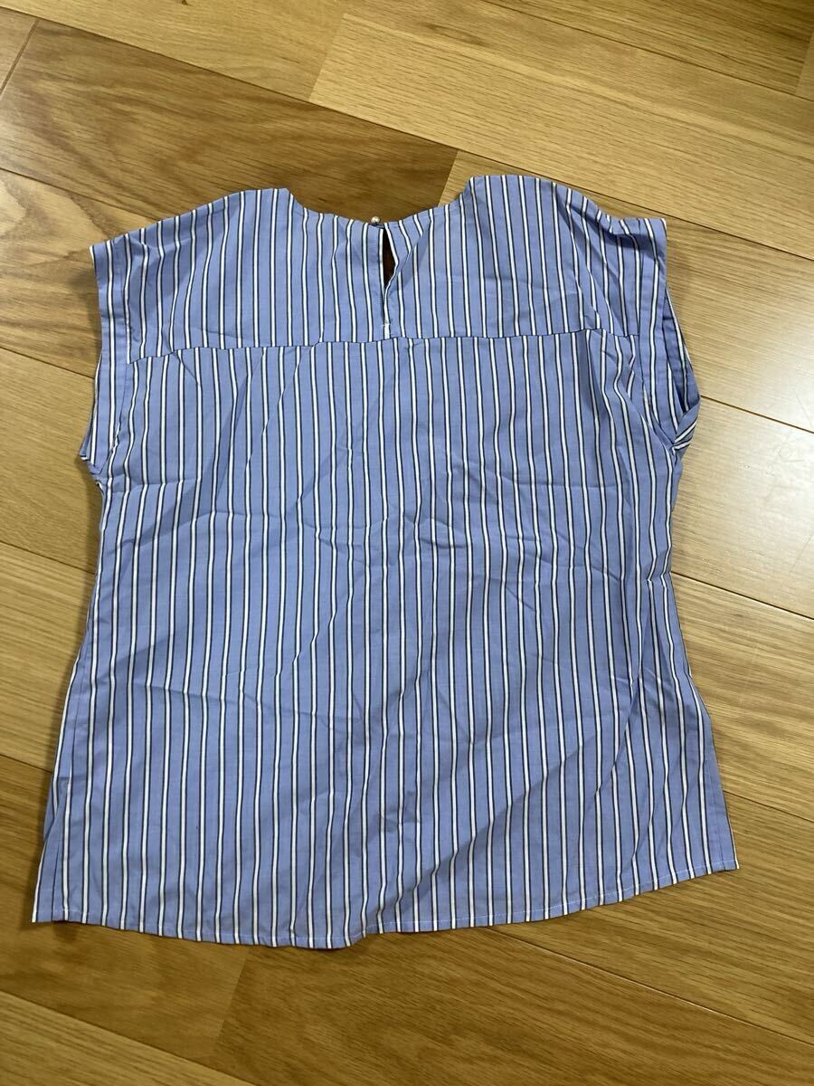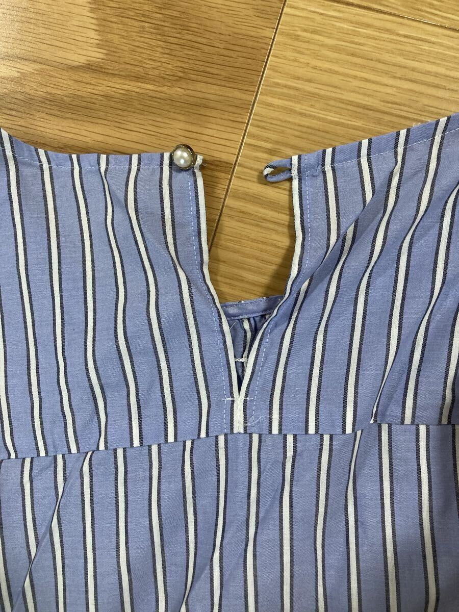 青と白のストライプのトップスとスカートのセットアップ、ウエストにベルト付きでスタイリッシュなセットアップです。