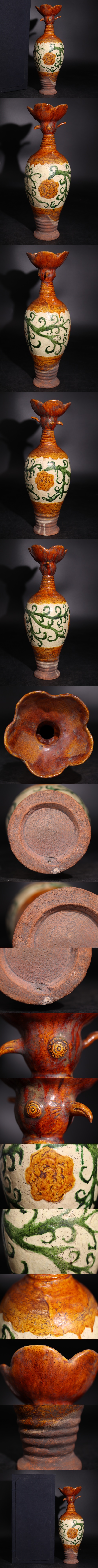 | 時代 三彩 鶏首 草花紋 花瓶 箱付 / 中国美術 色絵 花器 壺 煎茶飾 検索: 唐三彩 .G2804 |