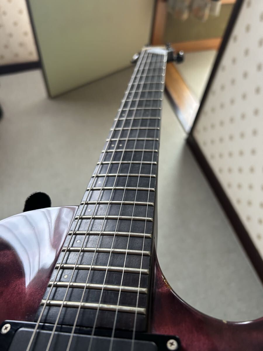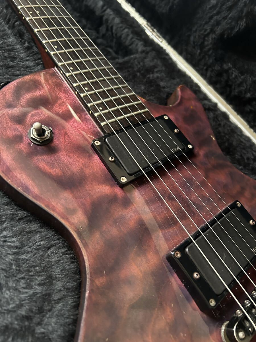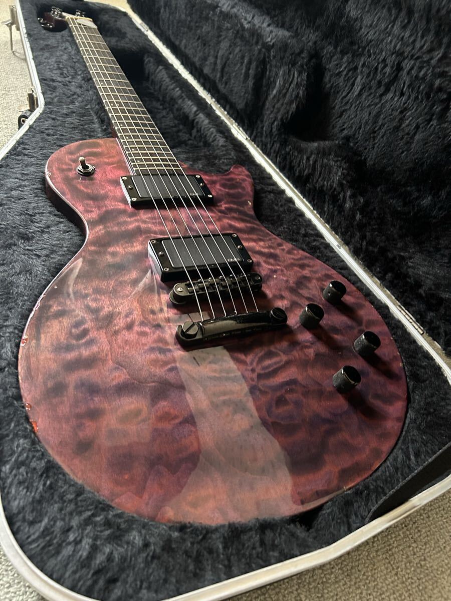 現在ではオーダー不可能の木材を使用したボディー、ネックにホンジュラスマホガニー材、ボディートップには鮮やかな木目のキルテッドメイプル材、指板には漆黒のエボニーを使う極上のスペックです。
