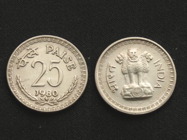 【インド】 1980年 25パイサ 国章 アショーカの獅子柱頭 白銅貨
