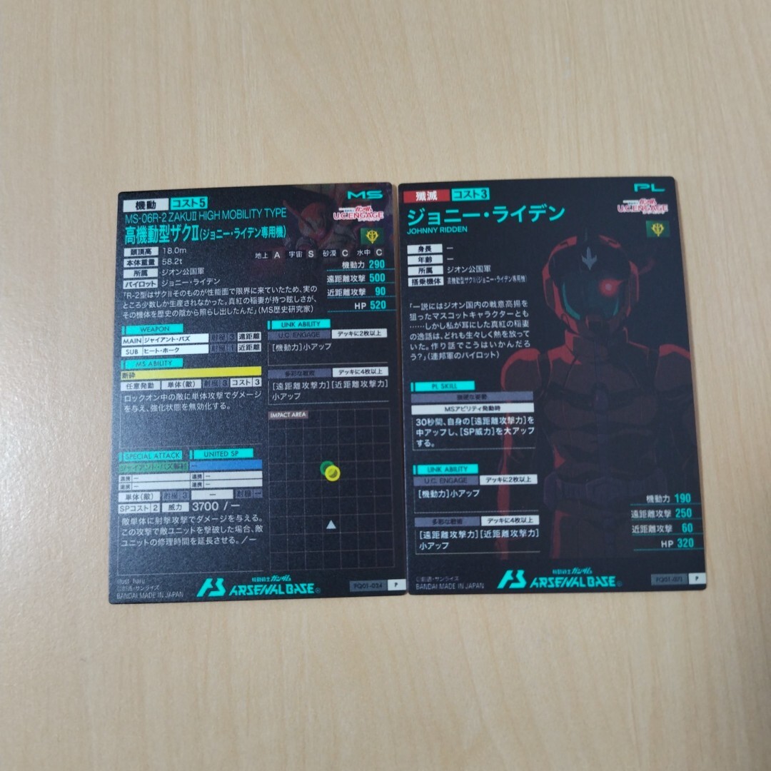 ガンダムアーセナルベース、Pレア、高機動型ザクⅡ(ジョニー・ライデン専用機)&ジョニー・ライデンの出品となります。未使用品です。排出後、スリーブに入れて保管していますが初期キズなど気になさる方はご遠慮ください。配送料金は梱包代込みで全国一律、120円とさせていただきます。他の出品との同梱は対応いたします。ノークレム、ノーリターンにてお願いいたします。