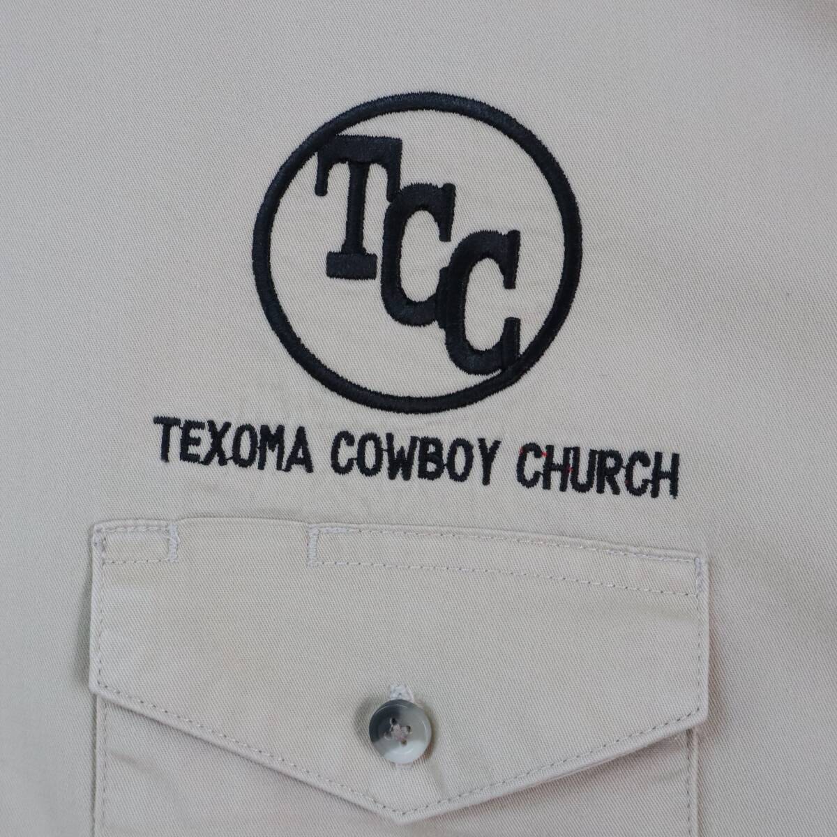 ・左胸に、アメリカ合衆国テキサス州にある教会”TEXOMA COWBOY CHURCH”のロゴ刺繍があしらわれている珍しいデザイン。
