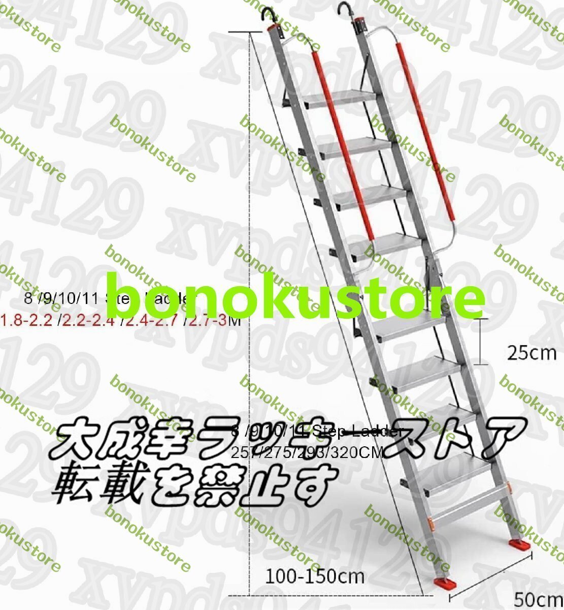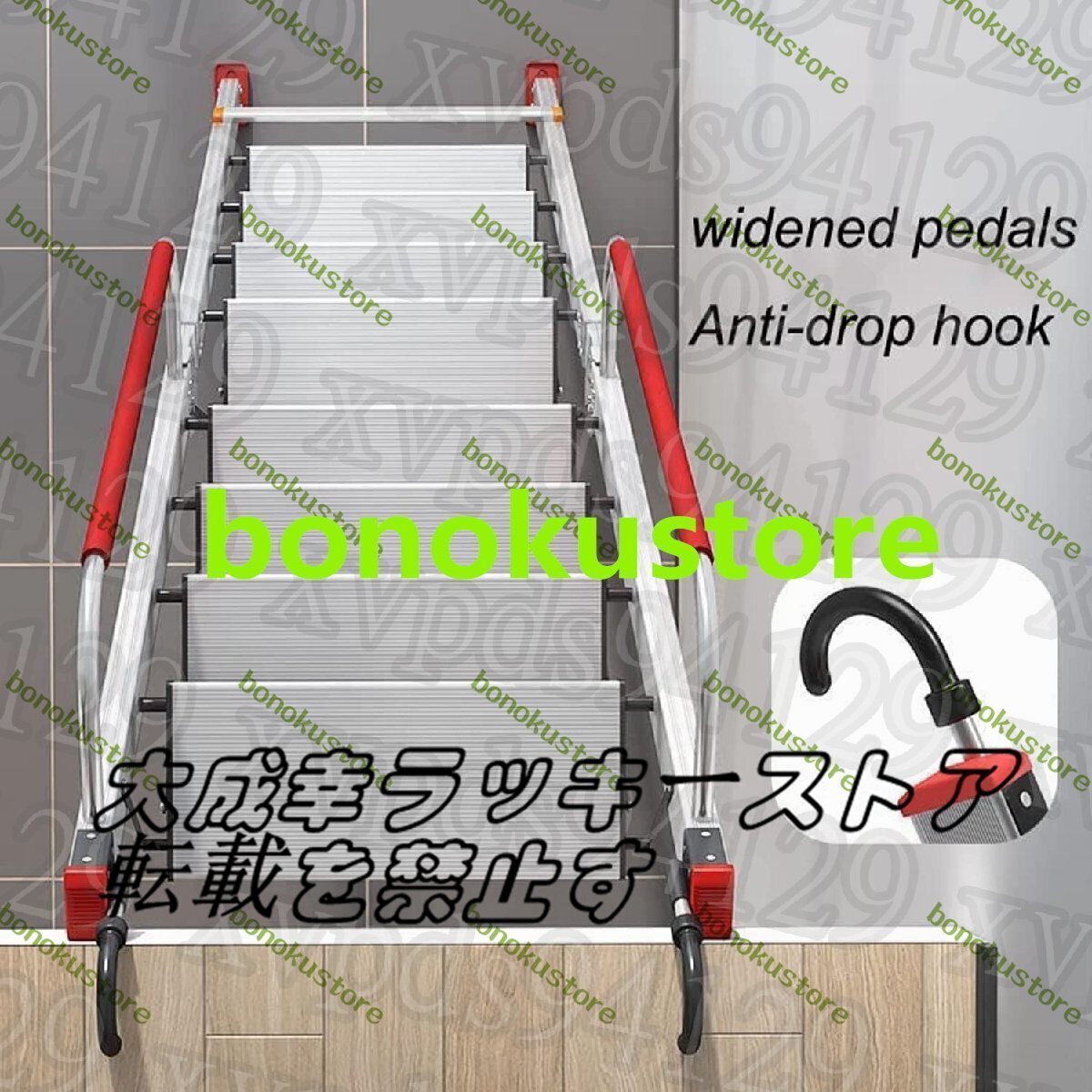 ダブルフックバランス支点、両側に高いアームレスト設計。スタビライザーバーとゴム製の滑り止めフットウェアを装備し、延長はしごの安定性と安全性を向上させます。 はしご使用時の揺れも心配ありません。素材: アルミ合金間隔: 25CM幅: 50CMスパン: 100-150CM 調整8 /9/10/11 ステップはしご 全長:257/275/293/320CM8 /9/10/11 踏み台 使用床高:1.8-2.2/2.2-2.4/2.4-2.7/2.7-3M包装内容明細書:屋根裏の階段×1