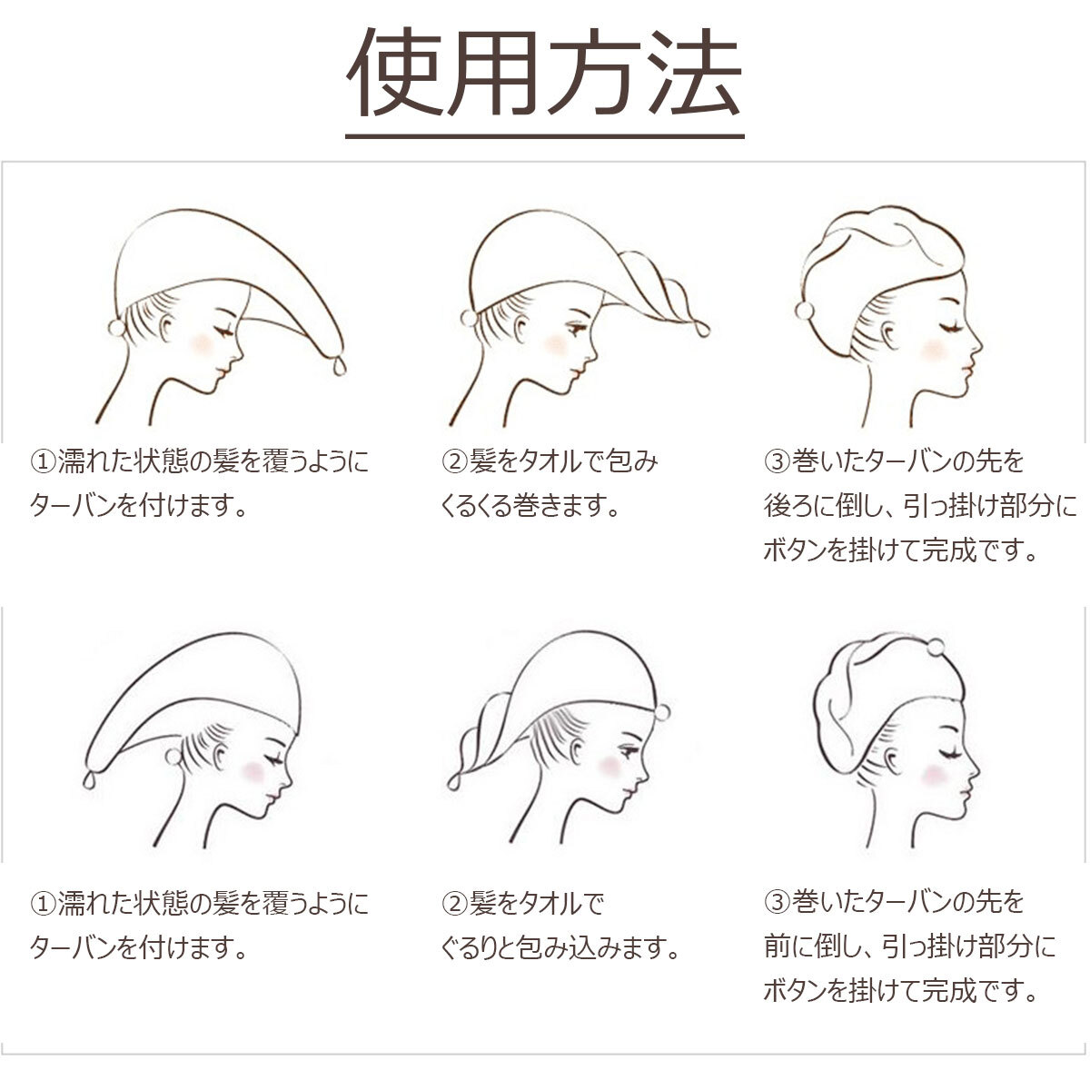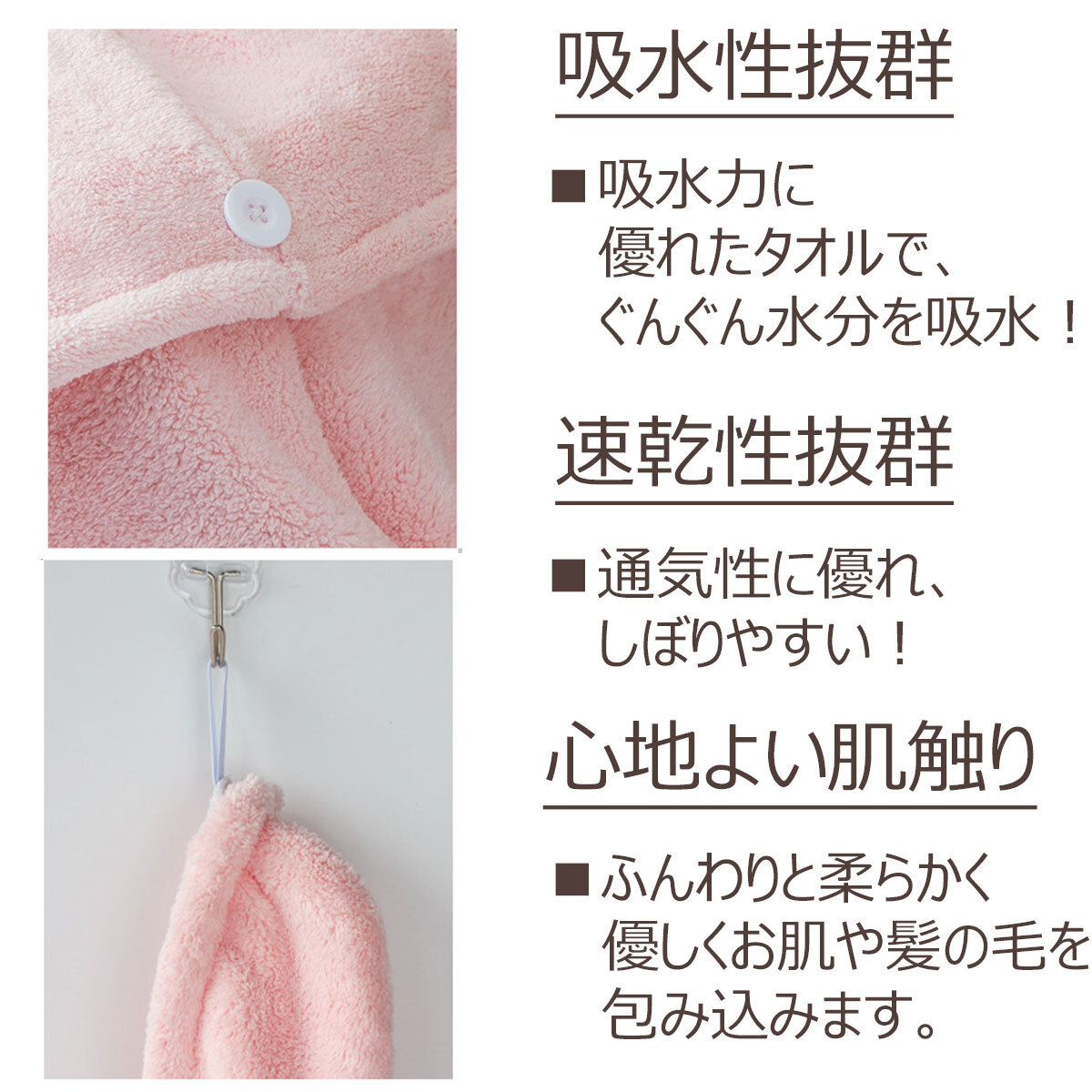 濡れた髪をすっぽり包む吸水ヘアキャップ♪ドライヤーで髪を乾かす時間を短縮でき、髪へのダメージを軽減します。
