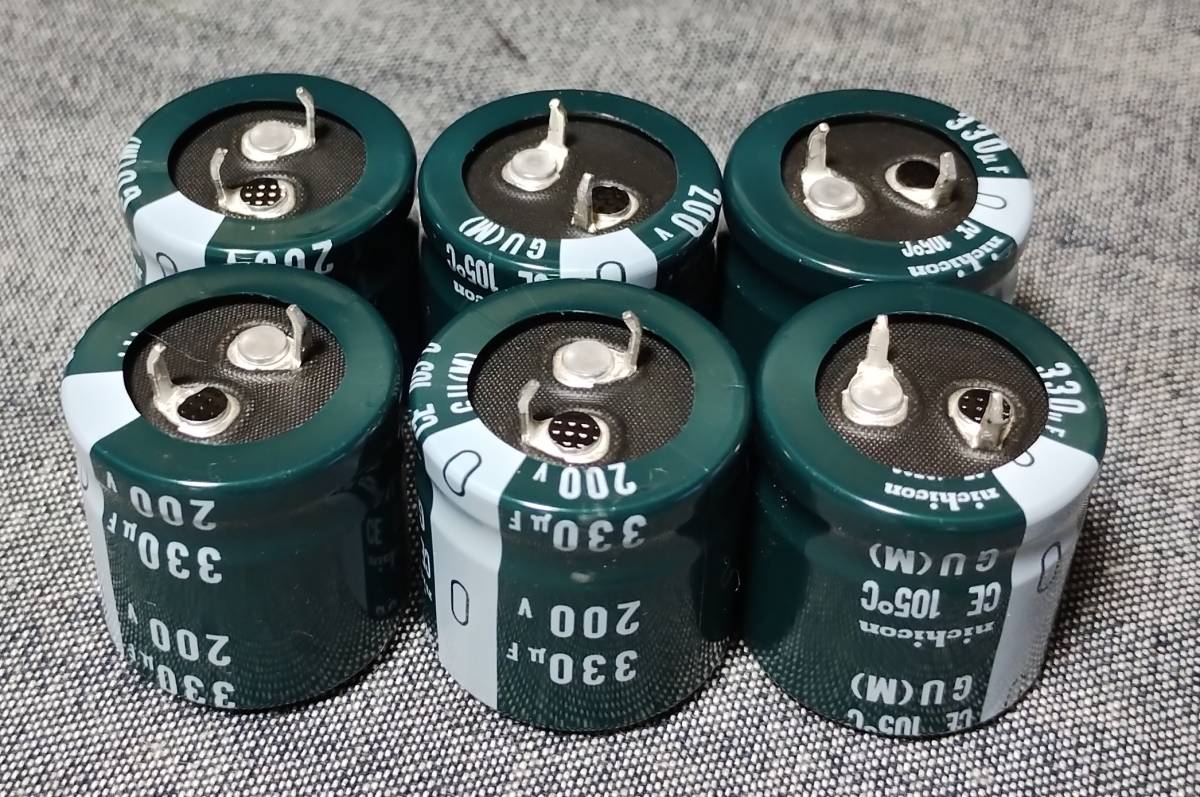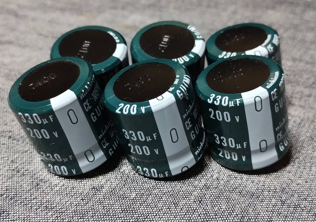 ・日本ケミコン 電解コンデンサ GU(M) 330μF/200V 6個セット 105℃の新品です。 ・大きさは実測で、直径約25mm、高さ約26mmです。(端子除く)