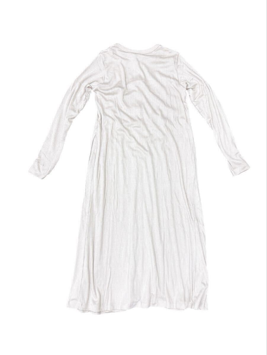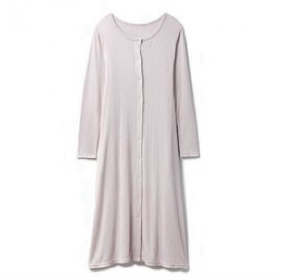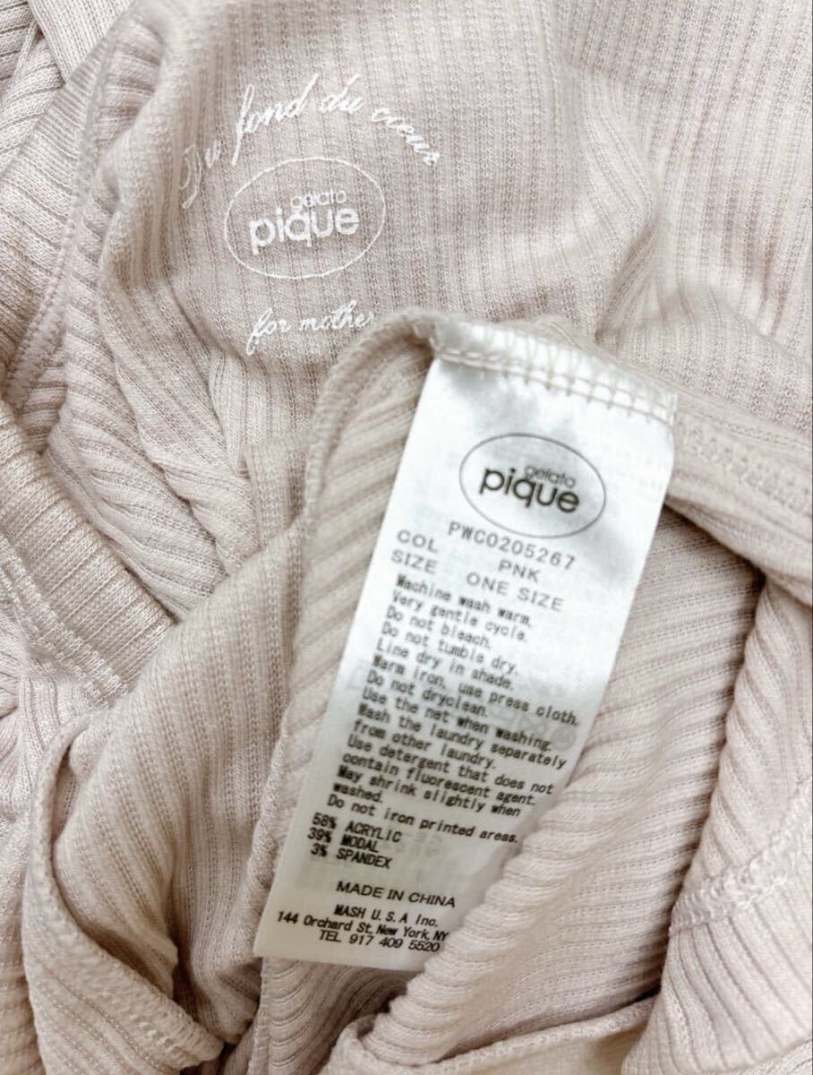 裾にかけてふんわりと広がるフレアシルエットは、妊娠中のお腹に負担をかけず、テレコ素材の縦畝がほっそり見えをアシストしてくれます。