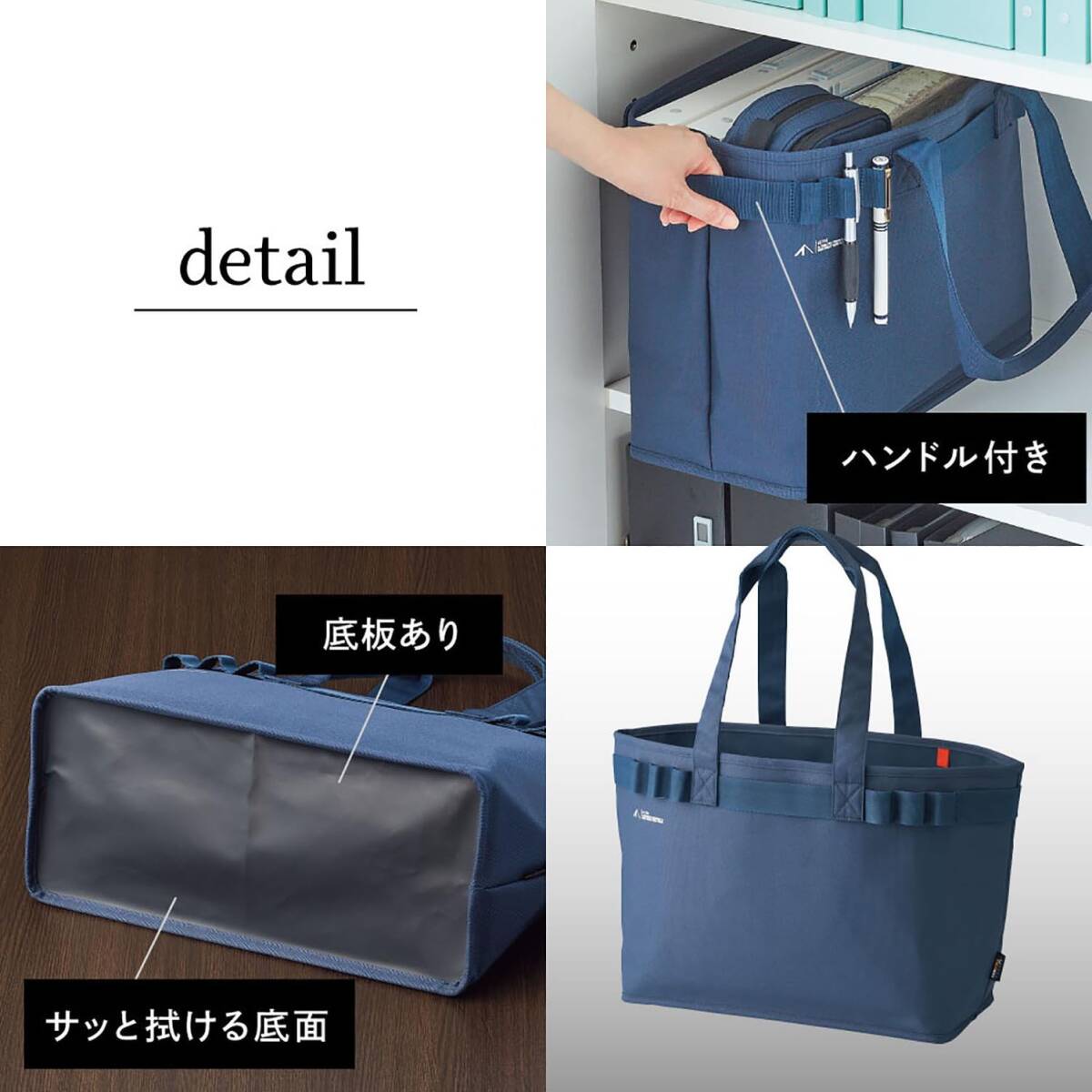 説明 軽いのにしっかり自立する、大容量で便利なツールバッグ。 しっかり自立する丈夫でコシの強い生地。 底面はサッと拭けるコーティング生地。 側面に引き出しハンドル付き。 手洗い洗濯可能。
