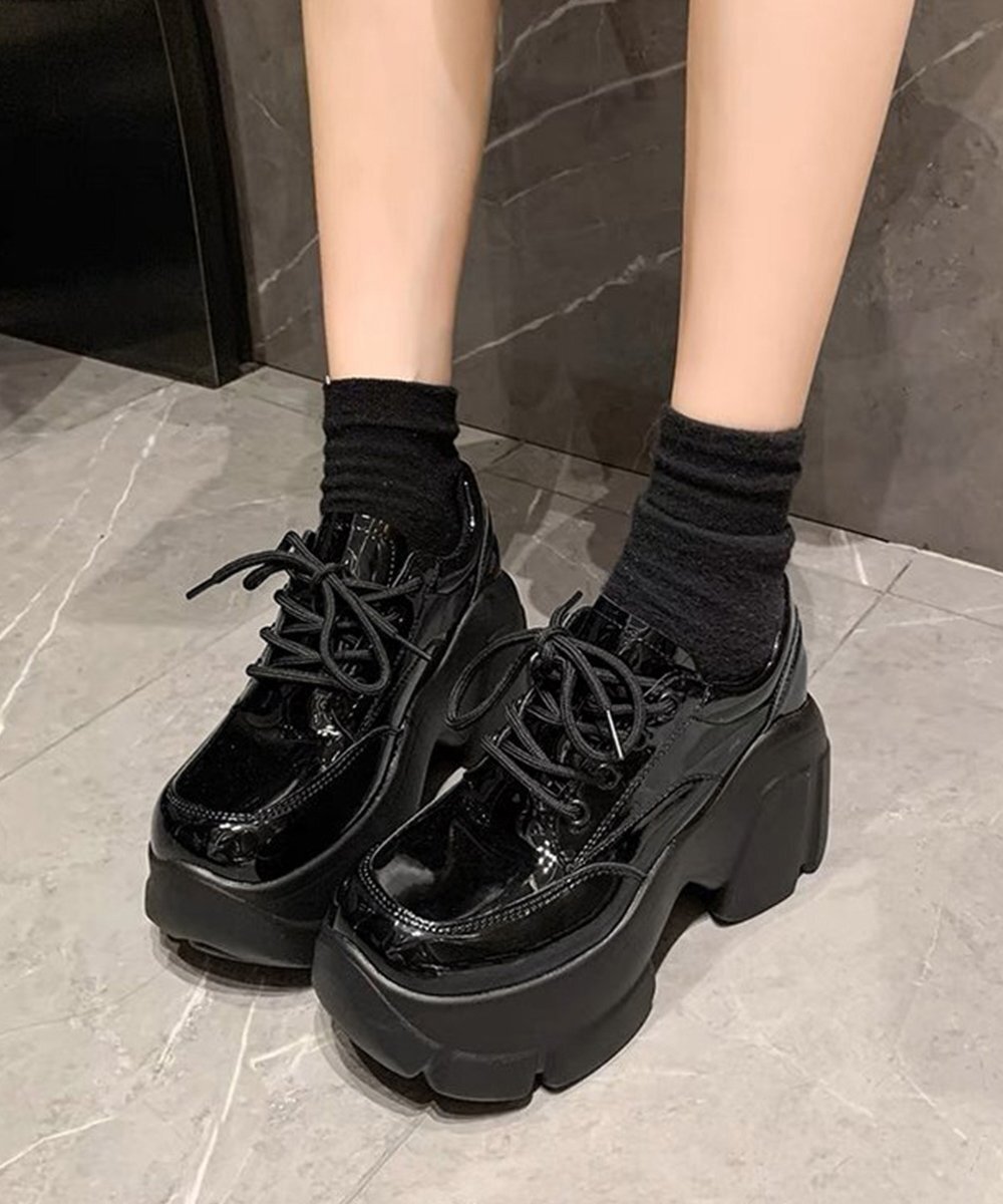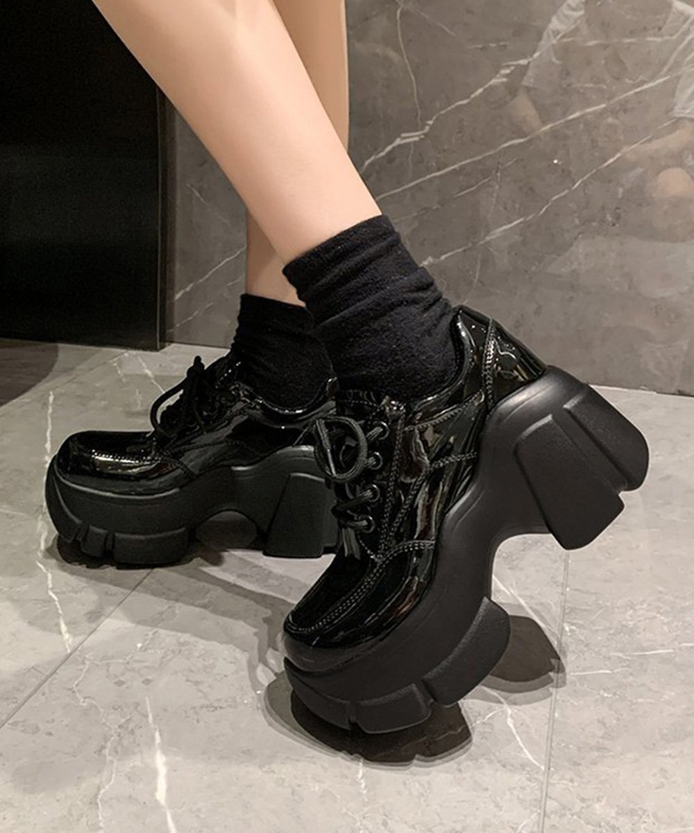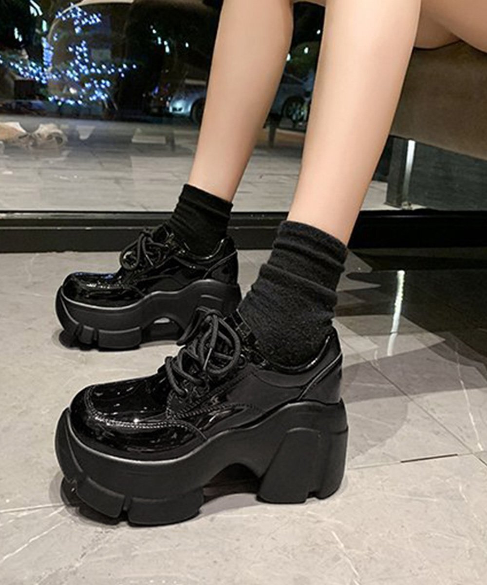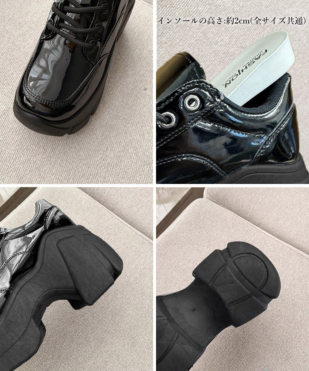 レディース ドレスシューズ 美脚脚長 ボリュームソール 歩きやすい 合皮厚底靴 編み上げ レザー調カジュアル 厚底5cm