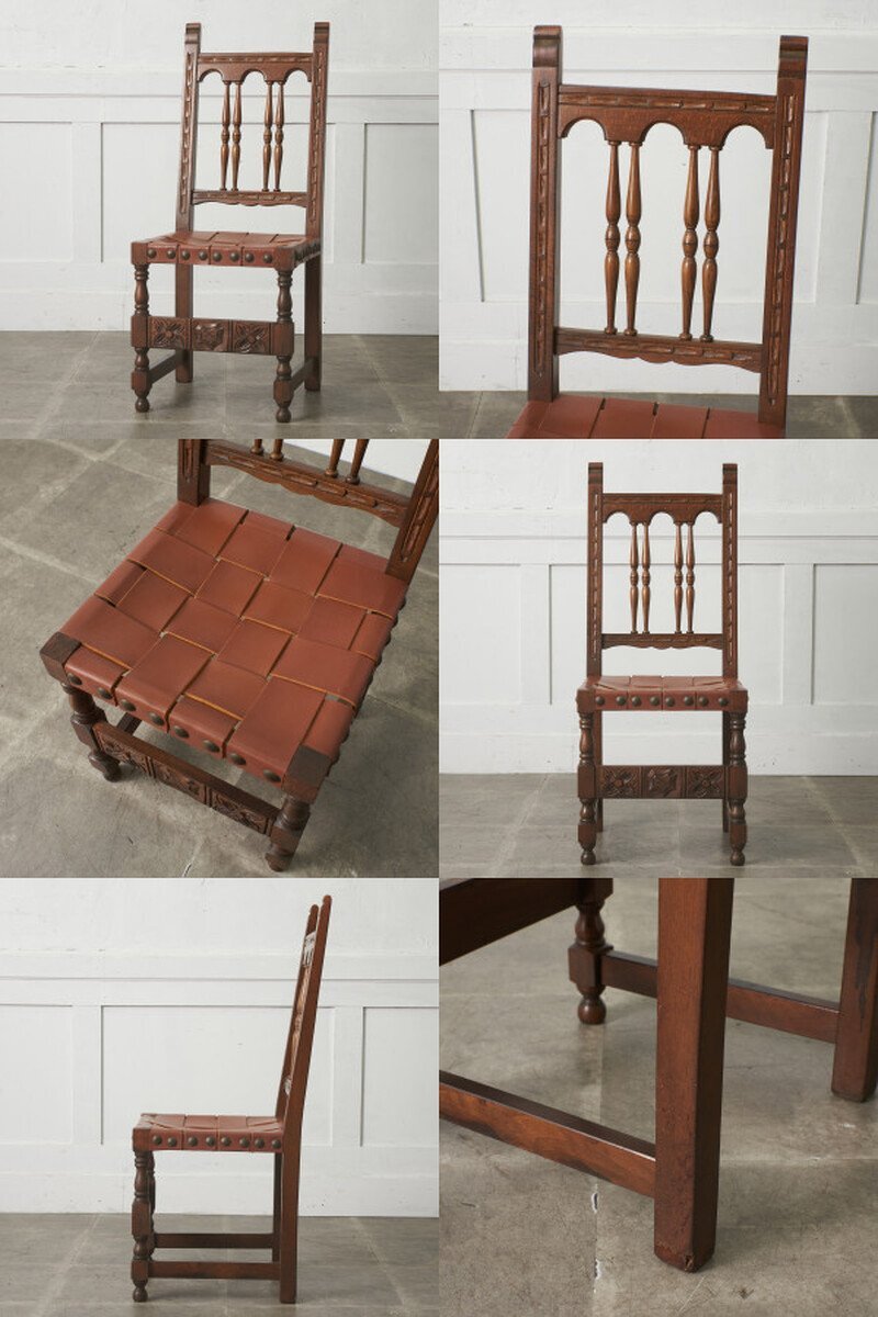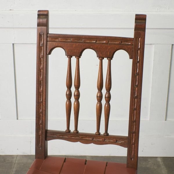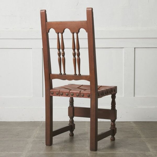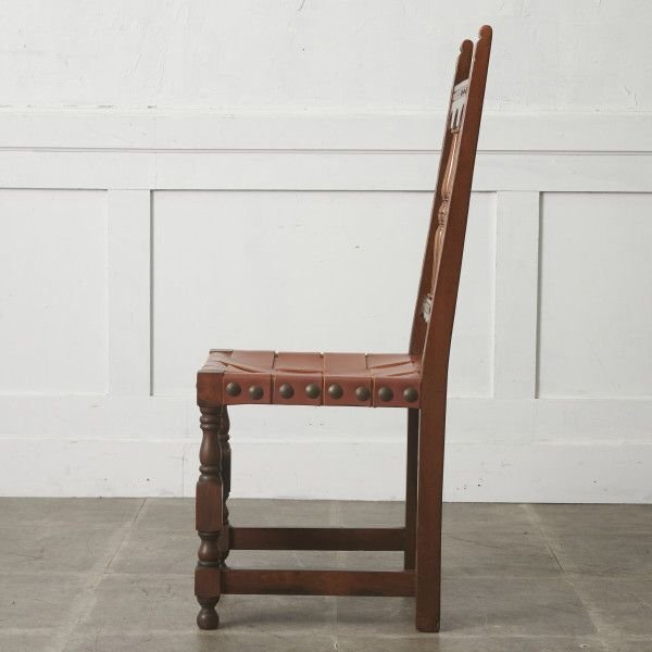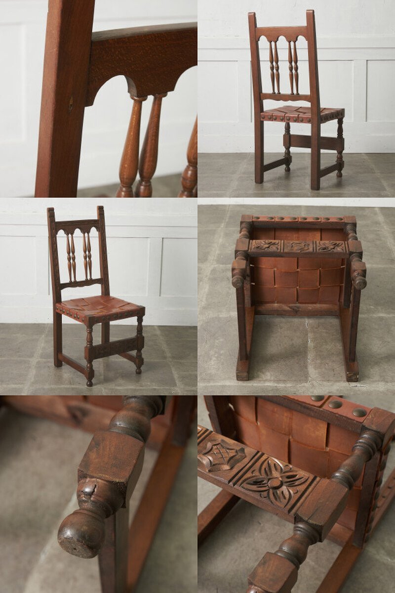 挽物装飾や木彫刻など随所に美しいディテールを備えたクオリティの高いチェア。座面のレザー張りや鋲打ちが重厚感のあるヴィンテージの風合いを醸し出し、使い込まれて程よく古びた風合いが素朴で優しい雰囲気を演出します。