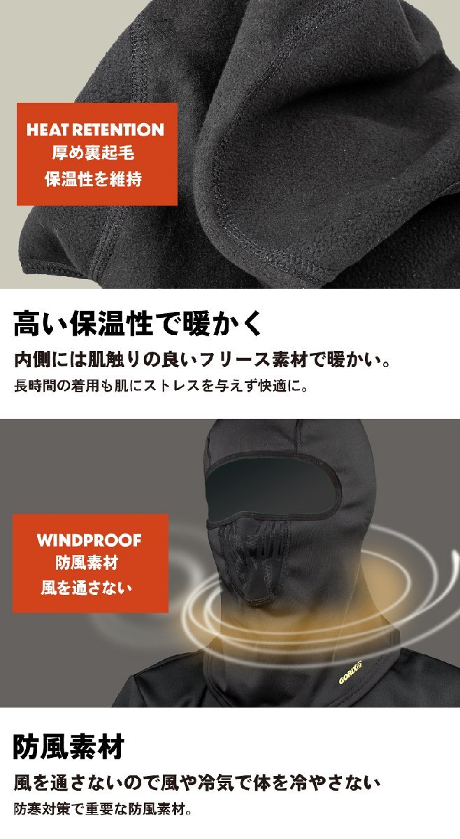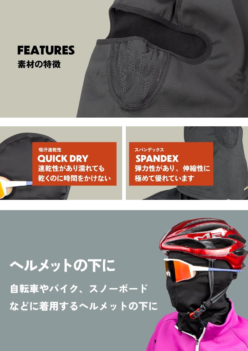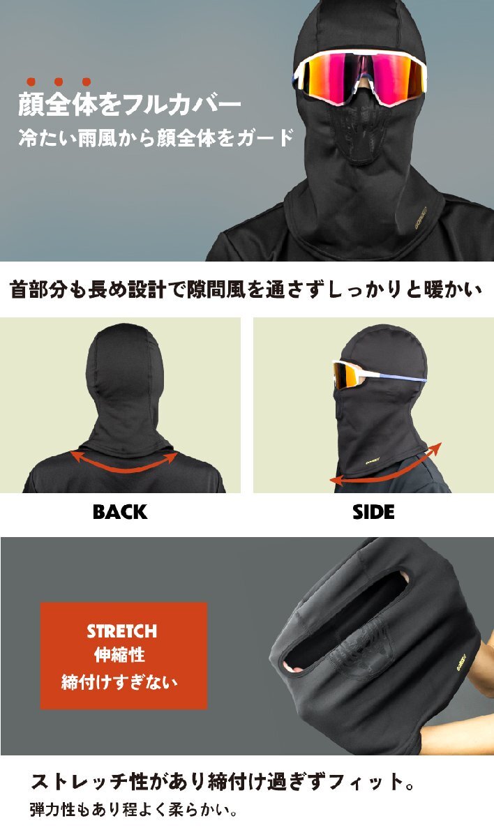 顔を出して野外活動をする際、冷たい雨風から顔全体をガードするフルカバーマスク。 空気中の粉塵から顔全体を守り、耳までしっかりと保護。 内部裏起毛(フリーズ)材質使用で保温性に優れ暖かい。 寒い時期の防寒対策にとても効果的で冬に重宝するバラクラバです。 自転車全般、バイク、スキースノーボード、ランニング、釣り、登山など野外活動や冬のスポーツ全般で大活躍! [通気性ある口鼻デザイン] 鼻から口元にかけては通気性の良いメッシュを採用。 立体性を与えかつメッシュ素材は呼吸がしやすくなりました。 長時間の装着も息苦しくなりにくい。スポーツに最適です。 [保温性] 内側は裏起毛素材で保温性に優れています。 またフリース素材は肌ざわりが良く長時間の着用もストレスを感じません。 [防風素材] 外側の生地には防風性に優れた生地を使用しているので冷たい風もしっかりとブロックします。 防寒対策で重要な防風素材となっています。 [顔全体をカバー] 冷たい雨風から顔全体をガード。首部分も長め設計で隙間風を通さずしっかりと暖かい。 [伸縮性] ストレッチ性があり締付け過ぎずフィット。 スパンデックス採用で弾力性もあり程よく柔らかい。 [吸汗速乾性] 速乾性があり水や汗で濡れても乾くのに時間をかけない。 [バラクラバ] 真冬にはとっても活躍するフルフェイスマスク。 自転車やバイクのヘルメットやスキー、スノーボードのヘルメットやキャップのしたに着用する事もできます。 サイクリングやスノボー、バイク、釣り、キャンプなどの様々なスポーツでも大活躍。 寒さや、埃、紫外線などの対策に。 商品内容冬用バラクラバ サイズフリー(メンズ/レディース兼用) 頭囲最小53cm~最大約63cm サイズ(平置き)幅約20/27cm、長さ約39/41cm(全体的に伸縮的、伸縮範囲約最大+10cm) 重量約80g 素材94%ポリエステル, 6%スパンデックス 《ご注意》 ・商品は入荷によりキズがある場合があります。 ・傷や細かい汚れが気になる方や神経質な方はご購入をご遠慮ください。 ・ディスプレイ環境により実物と色が異なる場合や、入荷時期により予告無く一部仕様変更する場合がございます。 |