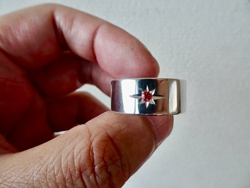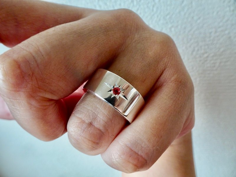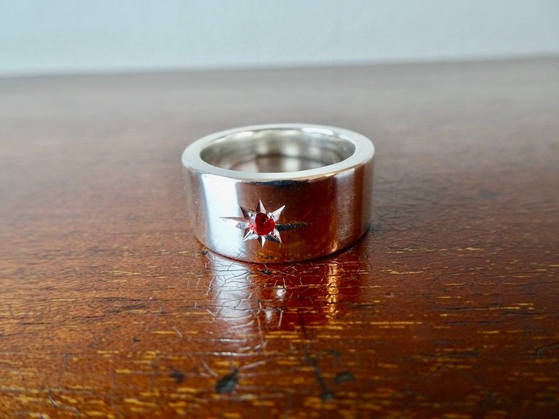 ■ ■ 商品名: 『一つ星2.6mmレッドサファイヤ、幅1cm、平打リング』 ■ ■ |