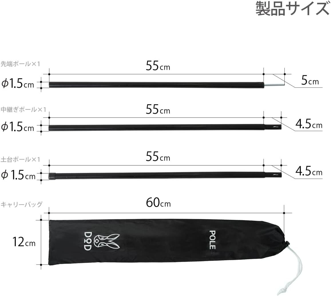 DOD(ディーオーディー) テント タープポール 2本セット ペグ&ロープ&収納袋付 黒 ブラック