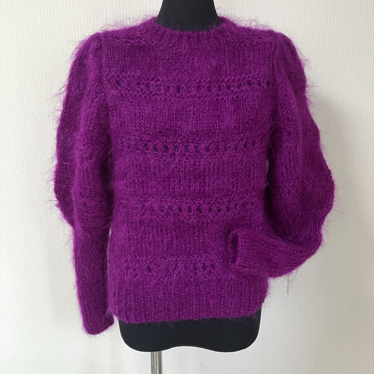 #プレゼント #誕生日 #母の日 #父の日 #手作り #ハンドメイド #ウール #セーター #透かし編み #パープル #模様編み #パフスリーブ #バレンタイン #M #秋 #冬 #棒針編み #クリスマス # #女性 #レディス # #
